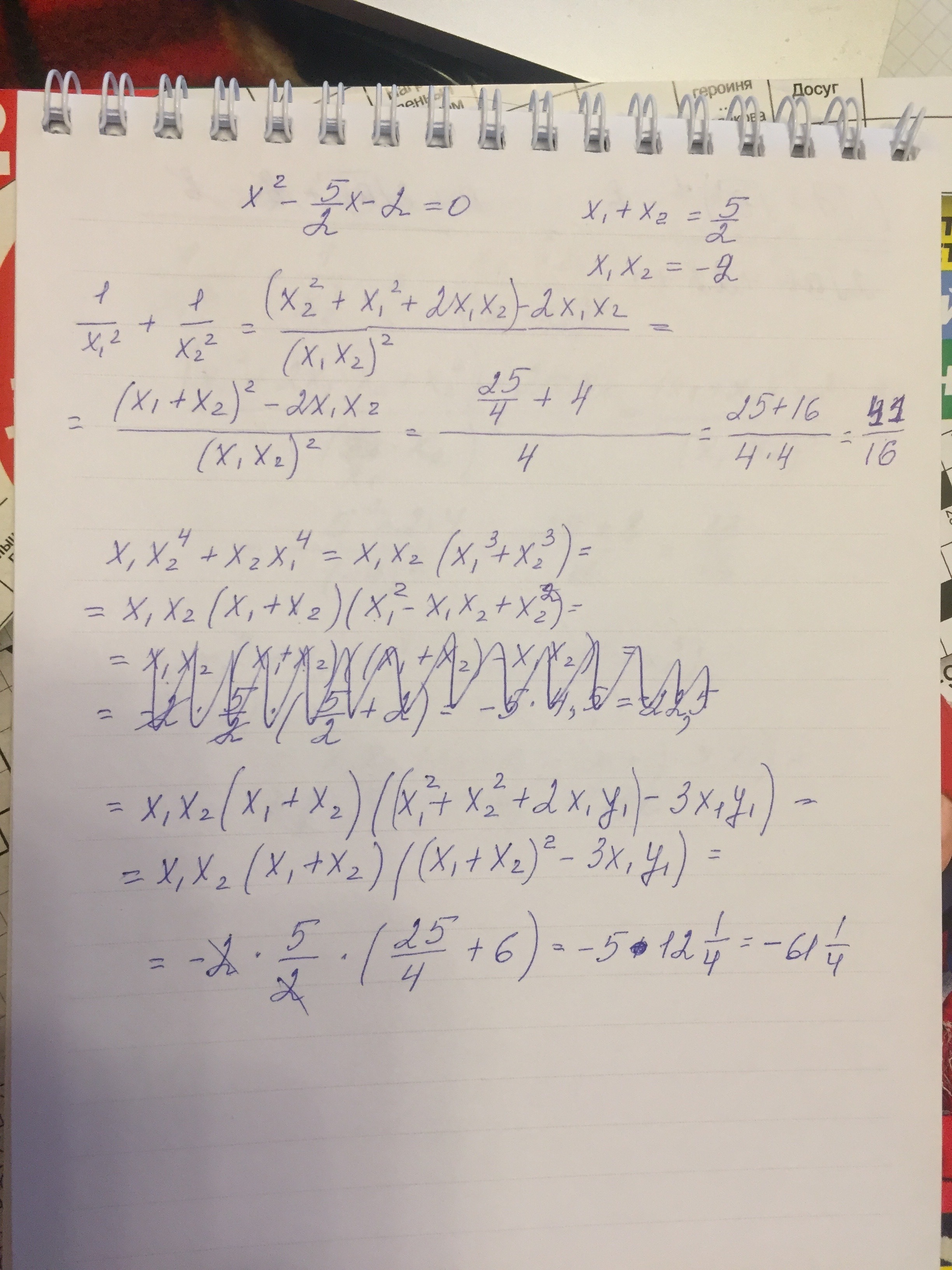 2) x1*x2^4+x2*x1^4=x1*x2(x1^3+x2^3)=x1*x2(x1+x2)(x1^2-x1*x2+x2^2)=x1*x2(x1+x2)((x1+x2)^2-3*x1*x2)=2,5(-2)(6,25-3*2)=-5(6,25-6)=-5*0,25=-1,25