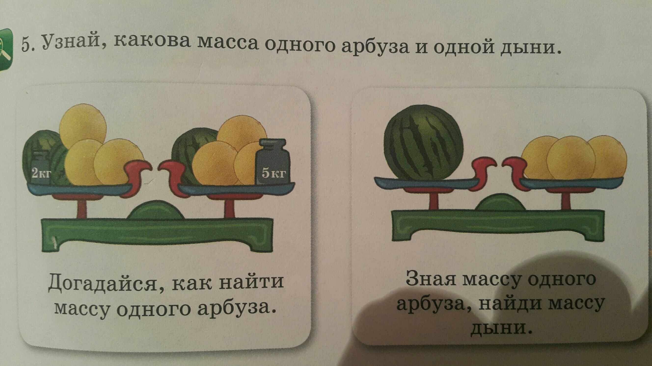 2 Арбуза и 3 дыни - 1 арбуз и 3 дыни=1 арбуз и 2 кг (гиря) = 5кг (гиря)