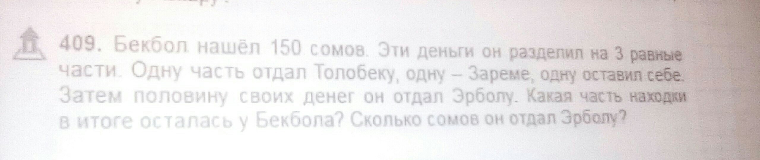 Ответ: Осталась у Бекбола одна шестая находки. Эрболу он отдал 25 сомов