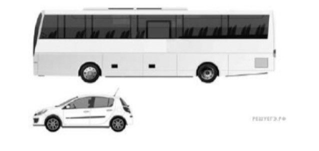 На рисунке изображены автобус и автомобиль. Длина автомобиля равна 4,2 м. Какова примерная длина автобуса? Ответ дайте в метрах.