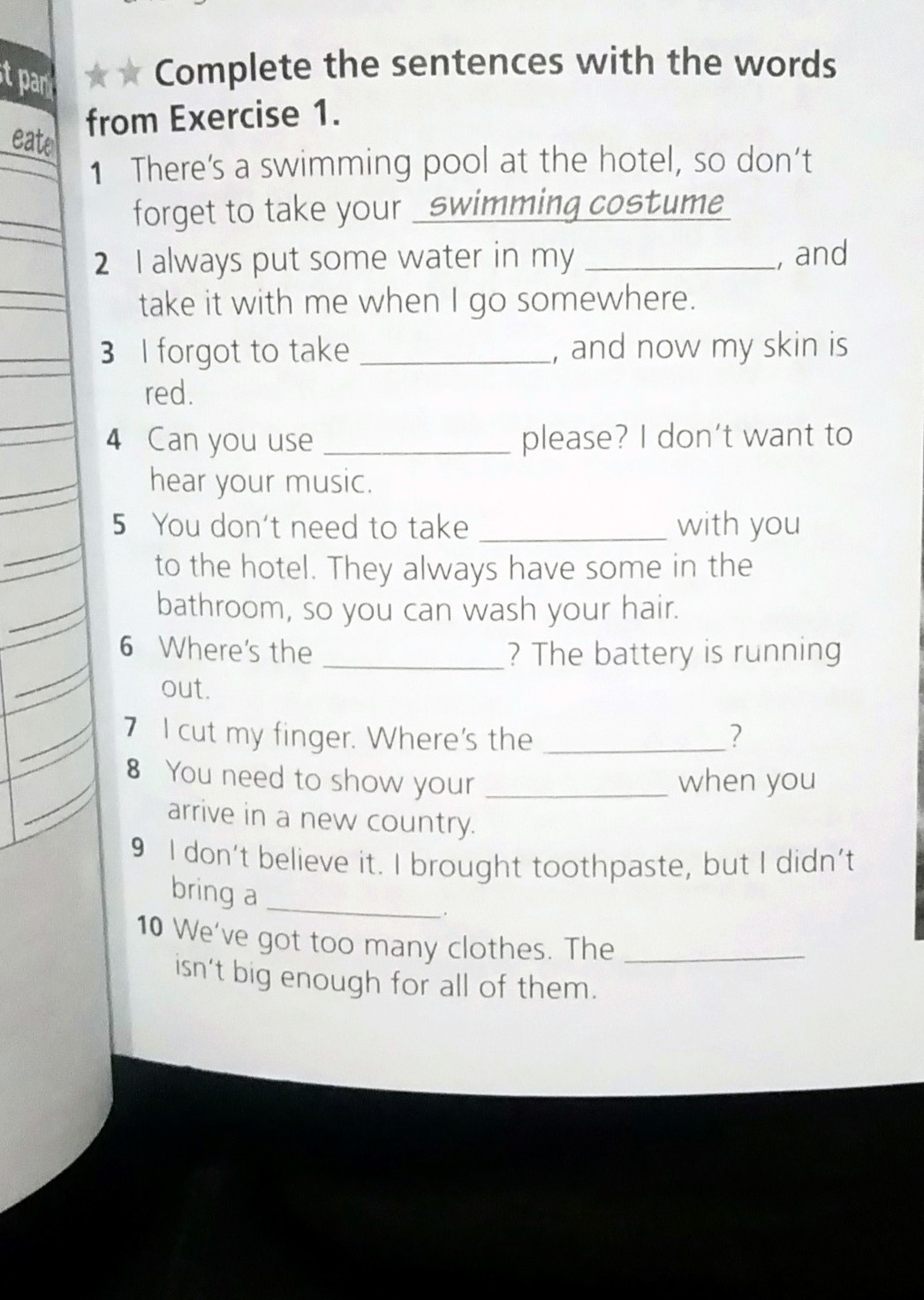 2backpack 3 sun cream 4 headphones 5 shampoo 6 phone charger 7 first aid kit 8 passport 9 swimming costume 10 suitcase