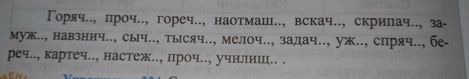 Горяч, прочь, горечь, наотмашь, вскачь, скрипач, замуж, навзничь, сыч, тысяч, мелочь, задач, уж, спрячь, беречь, картечь, настежь, училищ.