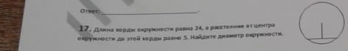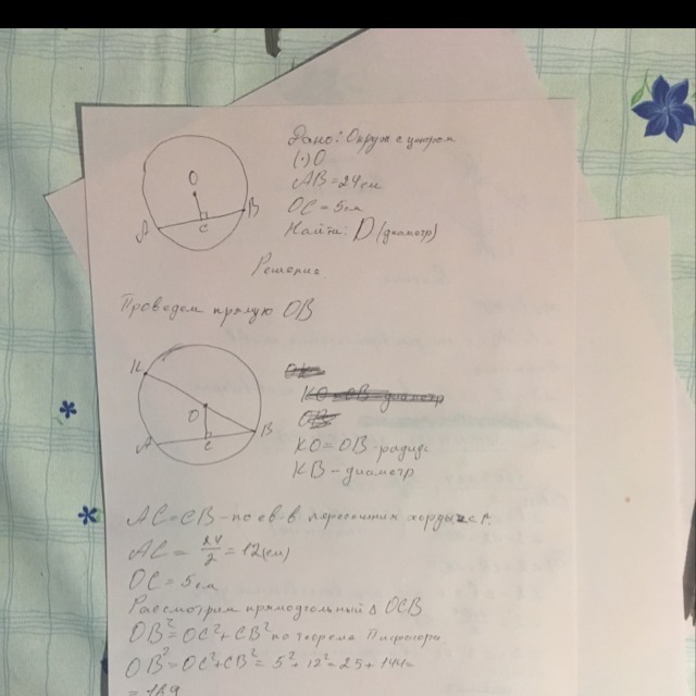 Длина хорды равна 24 ,а расстояние от центра окружности до этой хорды равна 5. найдите диаметр окружности .