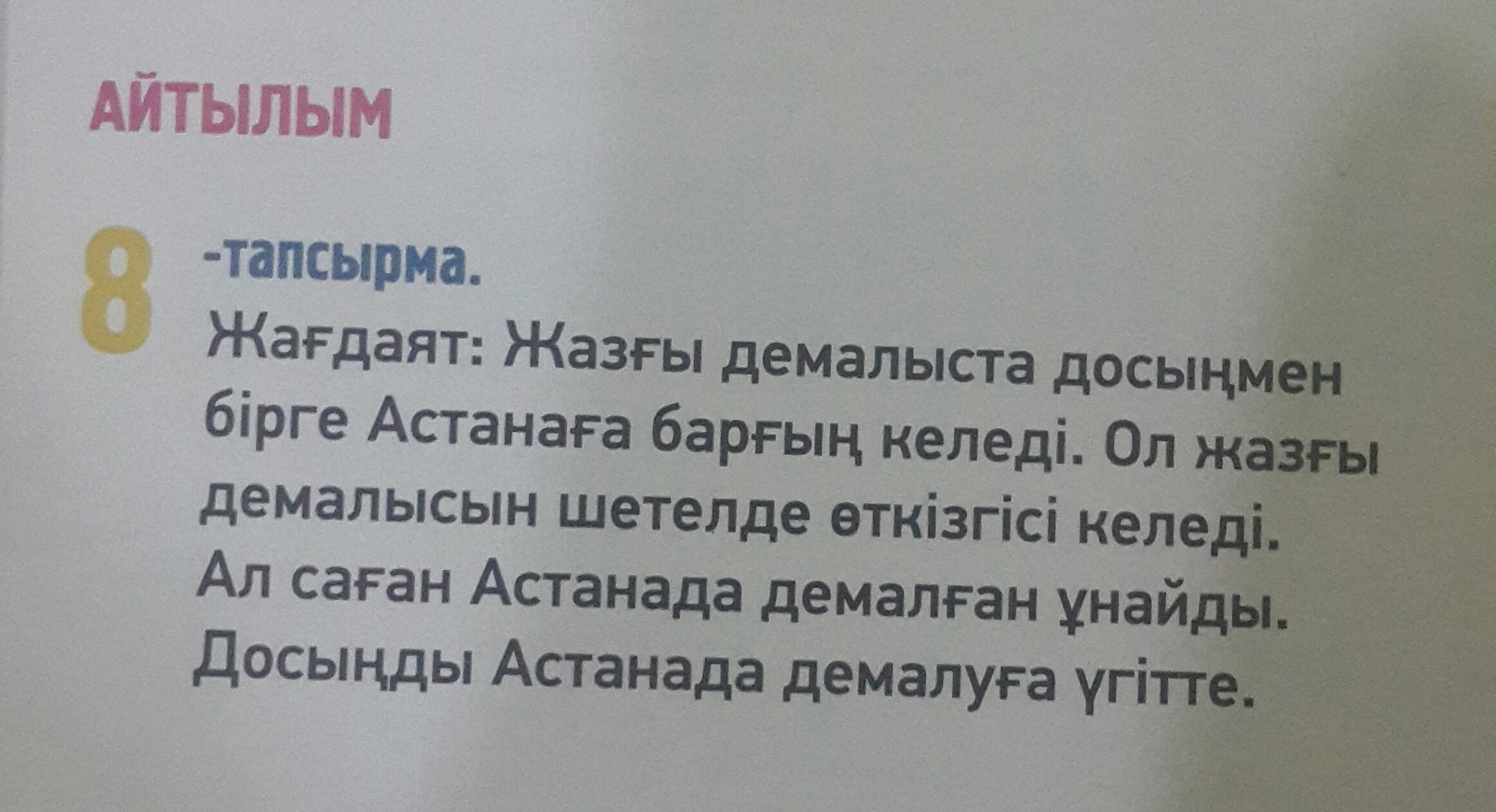 Сәлем, ... ! Қалың қалай? Не істеп жатырсың ? Менің мен Астанаға барғың келеді ме? Астана өте əдемі, дамыған және жас қала! Ол жақта досым сен Қаланың симболын Бəйтеректі, "Бейбітшілік және келісім сарайын" ,Ақ орданы және т.б. ғимараттарды көре аламын. Маған Астана қатты ұнайды? Ал саған ше? Осы жазда мен Астанаға демалысқа барамын! Сенде менімен баратын бедің?
