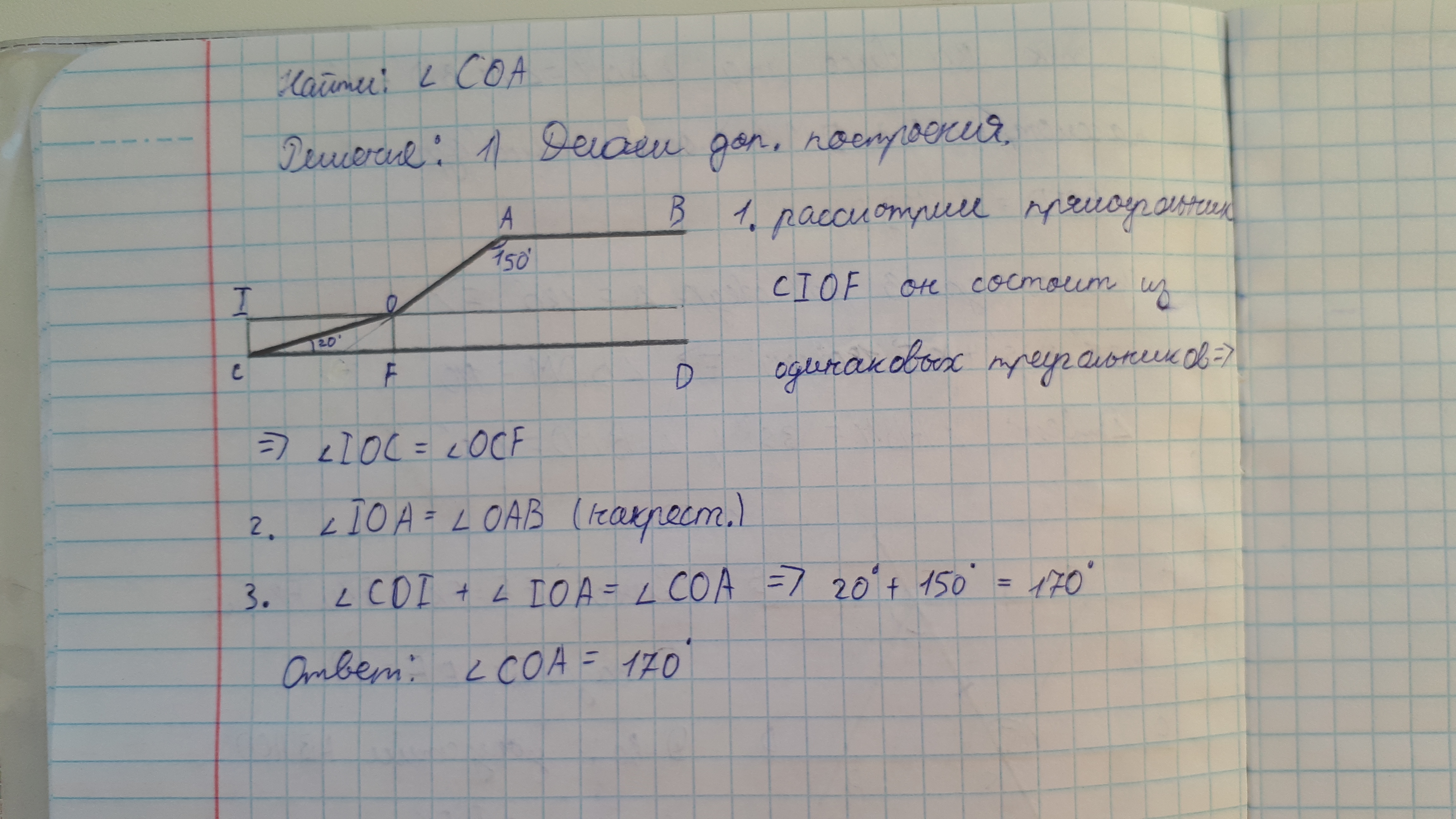 На рисунке 182 AB || CD. Найдите угол AOC, если угол BAO = 150 градусов, угол OCD = 20 градусов.