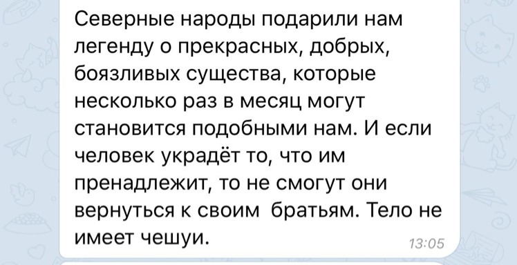северные народы подарили нам загадка легенду о прекрасных добрых боязливых существах которые несколько раз в месяц могут становиться подобными нам,и если человек украдёт то,что им принадлежит,то не смогут они вернуться к своим братьям.Теле не имеет чешуи