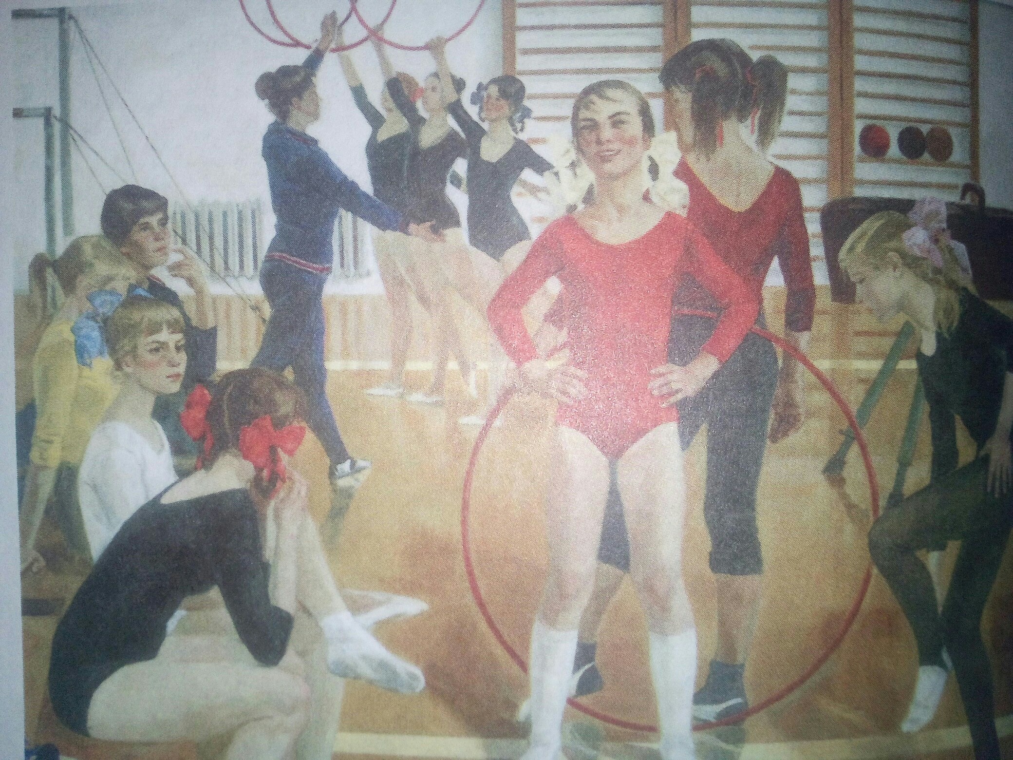 Девочки ровно держат осанку и дружно вытягивают обручи вверх. Их тренер — молодая женщина, наверняка очень опытная, возможно даже была чемпионкой. На самом дальнем плане я вижу гимнастические снаряды: турник, козел и шведскую стенку. Эта картина просто переполнена детскими эмоциями, надеждами, мечтами и победами.