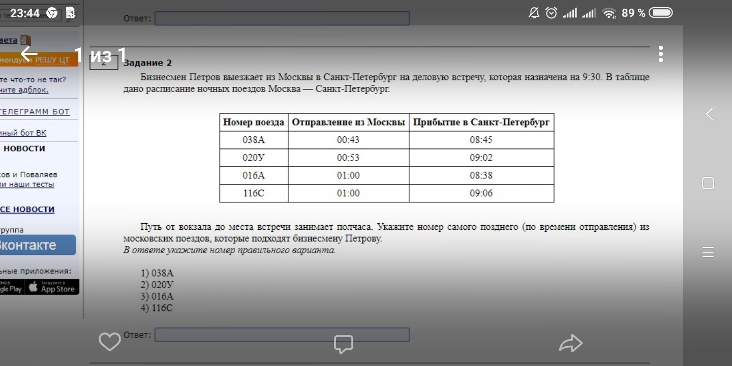 Поскольку путь от вокзала до места встречи занимает полчаса, поезд должен прибыть на вокзал не позднее 09:00. Этому условию удовлетворяют поезда под номерами: 038А и 016А. Из них позже отправляется поезд под номером 016А.