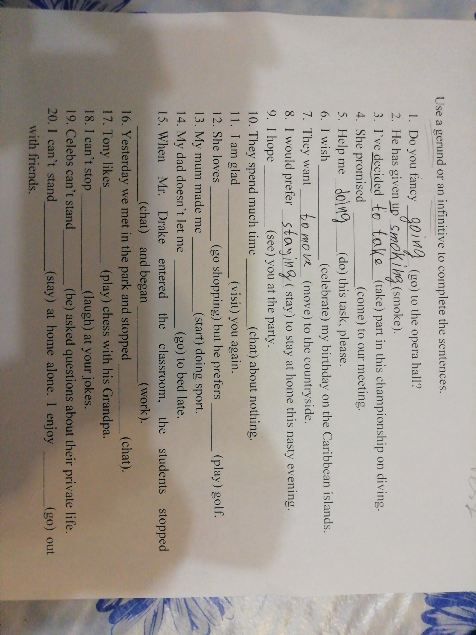 1.going 2.smoking 3.to take 4. to come 5. to do 6.to celebrate 7.to move 8. to stay 9.to see 10. chatting 11 to visit 12 going