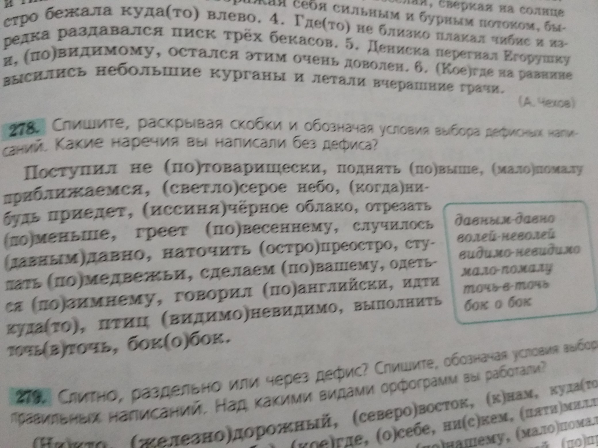 Поступил не по-товарищески, поднять повыше, мало-помалу приближаемся, светло-серое небо, когда-нибудь приедет, иссиня-черное облако, отрезать поменьше, греет по-весеннему, случилось давным-давно, наточить остро-преостро, ступать по-медвежьи, сделаем по-вашему, одеться по-зимнему, говорил по-английски, идти куда-то, птиц видимо-невидимо, выполнить точь-в-точь, бок о бок.