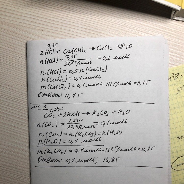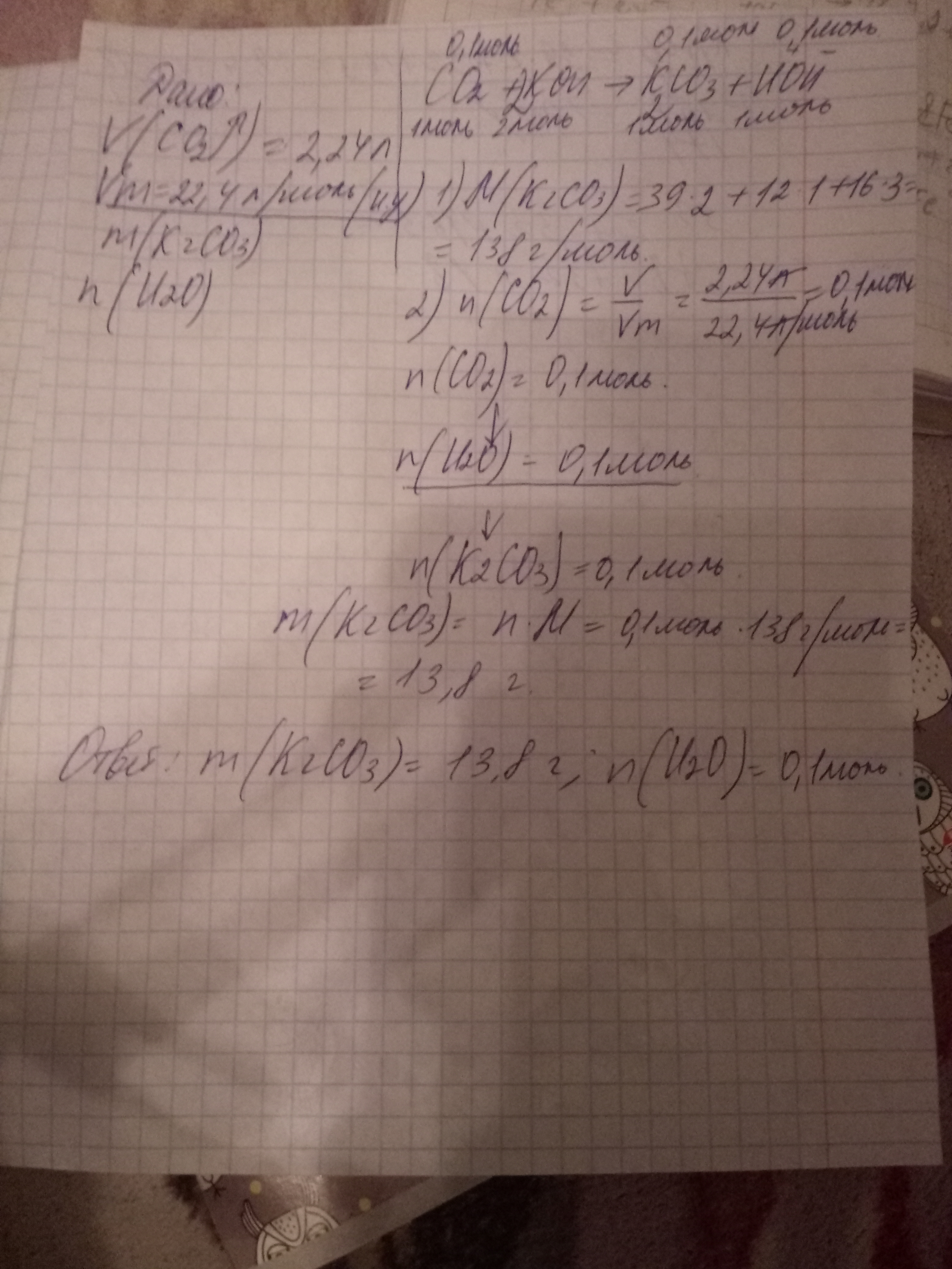 2. При взаимодействии 2,24 литра углекислого газа и гидроксида калия образовались карбонат калия и вода. Найдите массу полученной соли и количество моль воды.