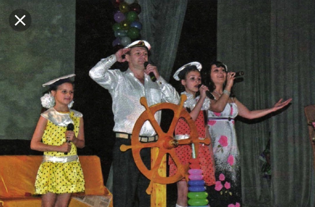 Перед нами сюжетный снимок, посвящённый теме "Семья". Фотограф выбрал момент, когда одна из семей выступает на сцене, участвуя в конкурсе "Мама, папа, я - счастливая семья" или в чём-то подобном. Об этом свидетельствует задний план фотографии: театральные занавеси, кулисы. Семья, состоящая из папы, мамы, дочки и сына, на конкурсе представляет экипаж яхты, где каждый ответствен за общее дело. Об этом свидетельствуют бескозырки и капитанская фуражка, выбранные в качестве элементов костюма, а одеты участники в яркие платья, белые рубашки и сттрогие брюки. Папа - капитан, глава семьи, осуществляющий общее руководство экипажем. Мама - лоцман, от которого зависит курс судна. Дети - юнги, помощники во всех начинаниях. Если так устроена семья, судно не потерпит крушения, не сядет на мель. У всех членов семьи в руках микрофоны - всё же это зрелищное действо. Мама и сын исполняют песню, а папа отдаёт нужные команды - в руках у него штурвал, символ руководства процессом. Дочь - верный помощник, никогда не подведёт. Так, символически показана роль каждого участника семьи в жизненном море, и художник верно смог поймать интересный момент выступления, где это проявляется особенно ярко. Фотография оставляет приятные впечатления сплочённости семьи, радости и поддержки друг друга..