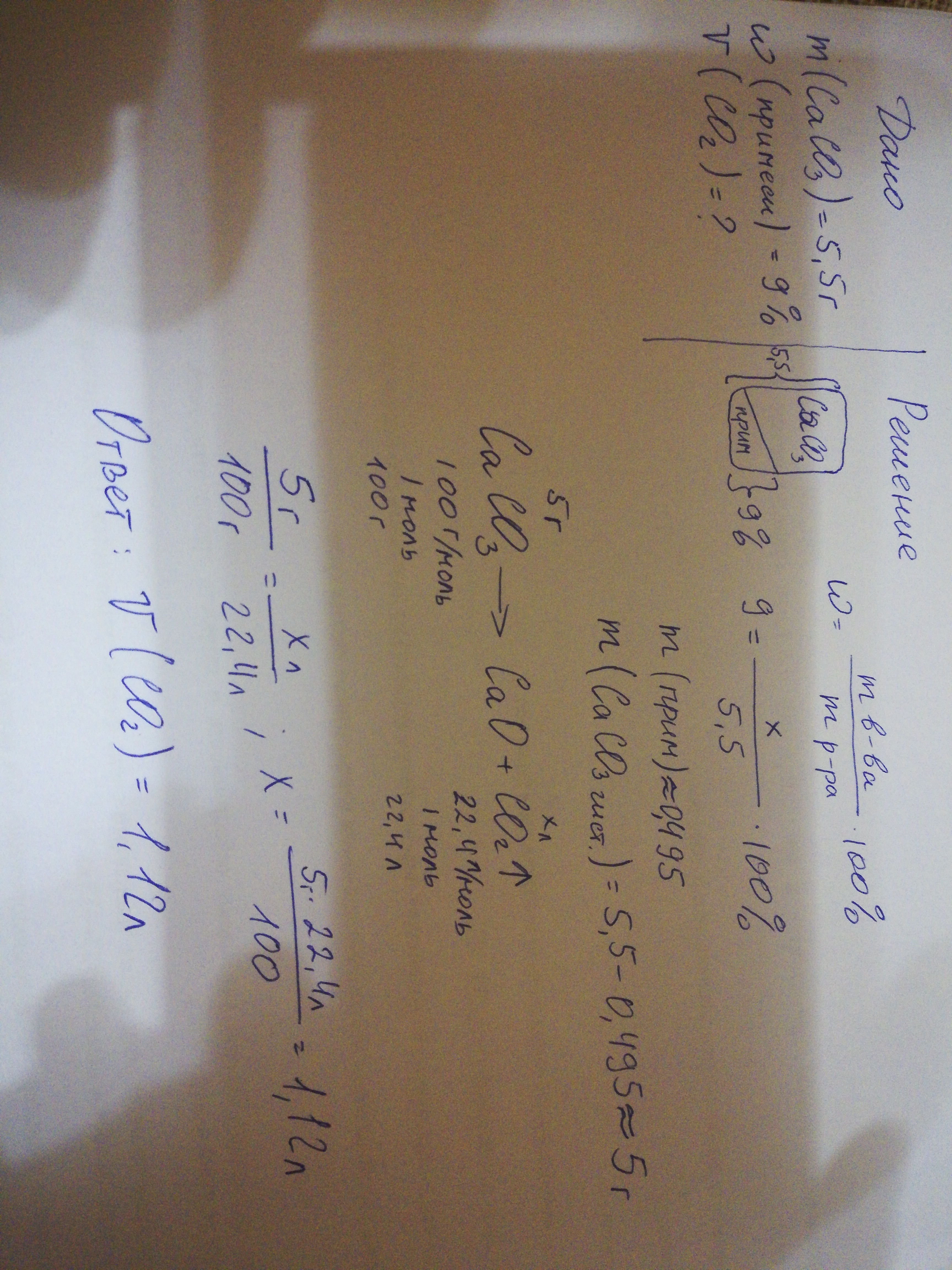 мел,основая составляющая которого caco3 мамой 5,5гс массовой долей примесей 9% нагрели.Найди объем углекислого газа который виделился