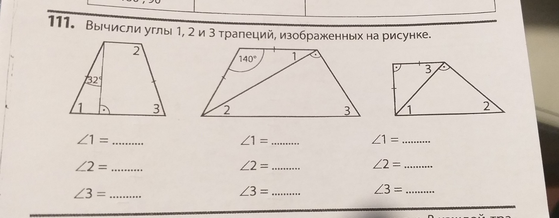 Извините, но я остаюсь при своём мнении. В задании четко написано, что нужны углы именно трапеции. При всём уважении, в №2 углы 2 и 1 - это углы треугольников, образованных диагональю трапеции. А на чертеже, чтобы указать углы именно треугольников и убрать неоднозначность задания, должны были нумерованные углы показать дугами.