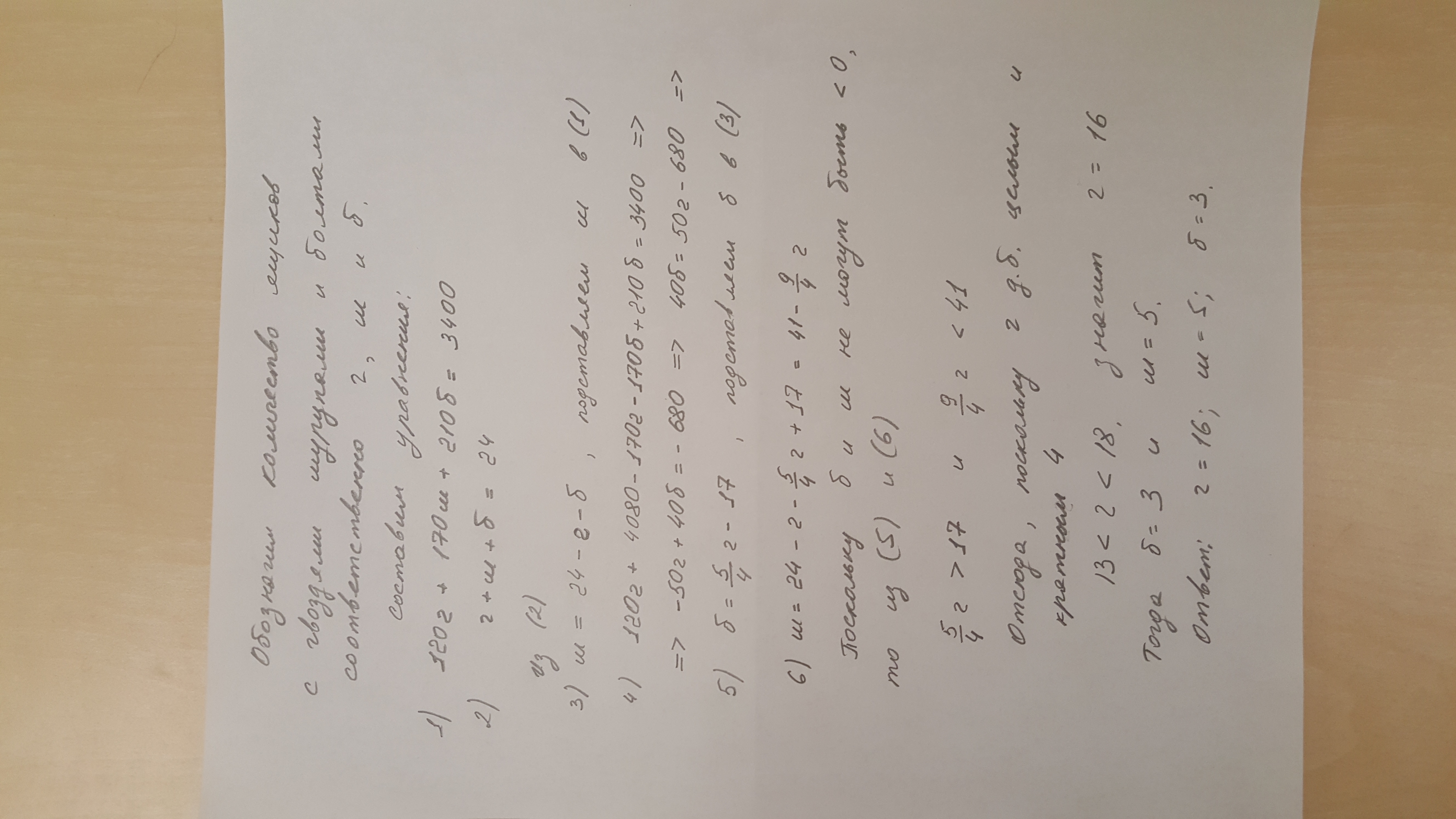 в магазине купили гвозди ,шурупы и болты в упаковках по 1 кг,всего 24 упаковки,на сумму 3400руб.Цена упаковки гвоздей-120руб,шурупов-170руб,болтов-210руб.Сколько упаковок гвоздей,шурупув и болтов было куплено?