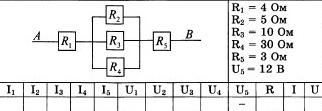 Определите значение силы тока и напряжения на каждом резисторе, полное сопротивление, полную силу тока и полное напряжение участка. Заполните таблицу