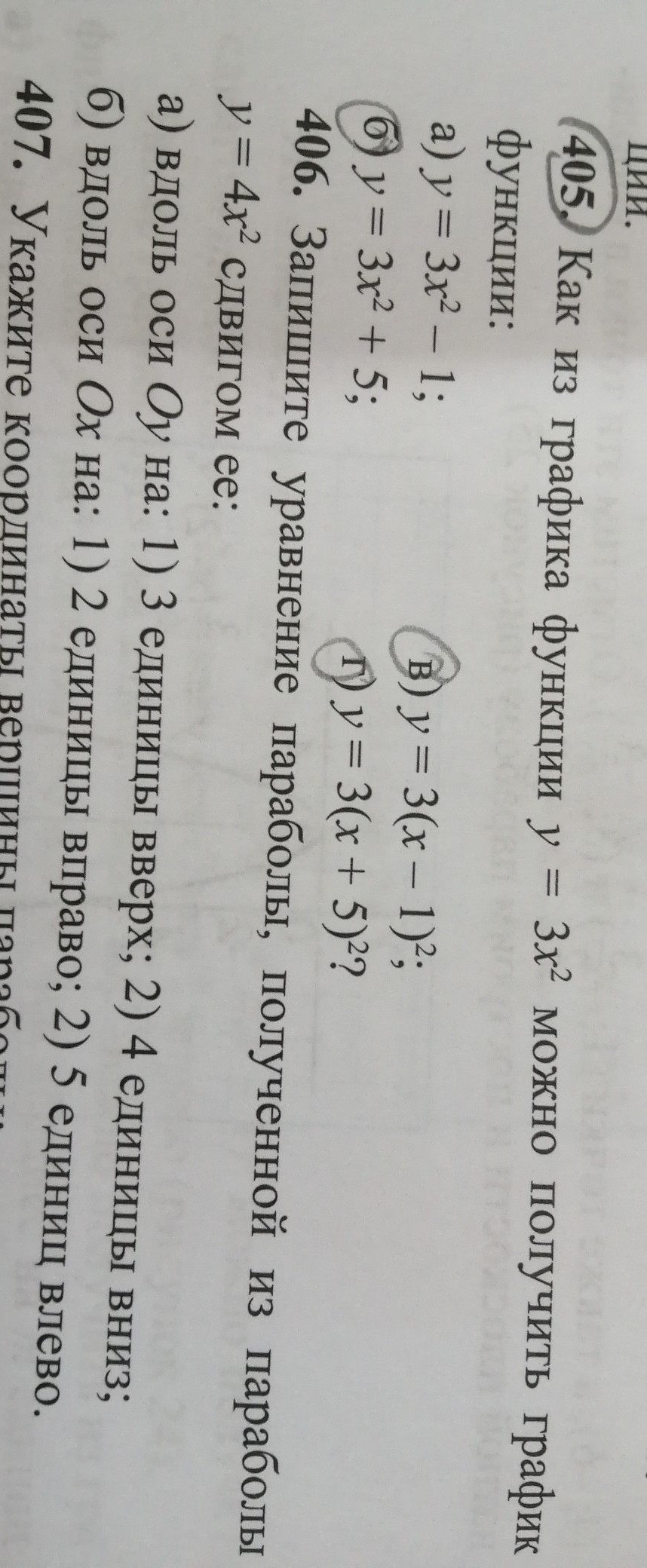 405.а).сдвигаем параболу на 1 вправо по оси Х,т.к.-1 ;б).на 5 влево,т.к.+5 в) на 1 вправо; д).на5 влево. 406.а)у=4х^2+3; у=4х^2-4;б).у=4х^2-2;у=4х^2+5