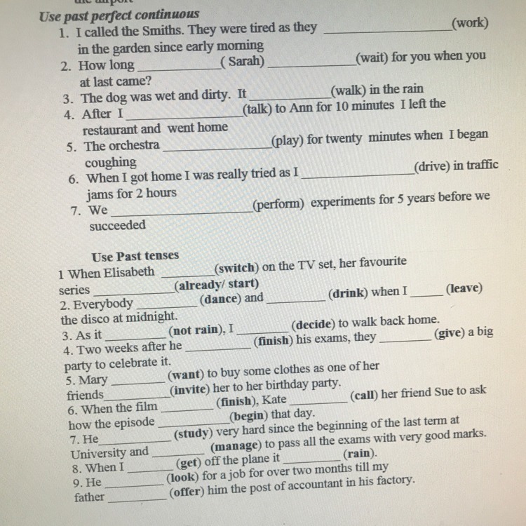 1 switched - had already started 2 was dancing -drinking -left 3 wasn’t raining - decided 4 had finished -gave 5 wanted -had invited 6 finished -called -had begun 7 had been studying-managed 8 got off- was raining 9 had been looking -offered