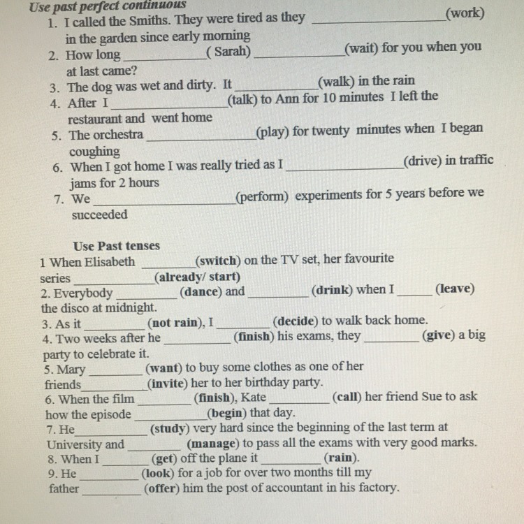 1 switched - had already started 2 was dancing -drinking -left 3 wasn’t raining - decided 4 had finished -gave 5 wanted -had invited 6 finished -called -had begun 7 had been studying-managed 8 got off- was raining 9 had been looking -offered
