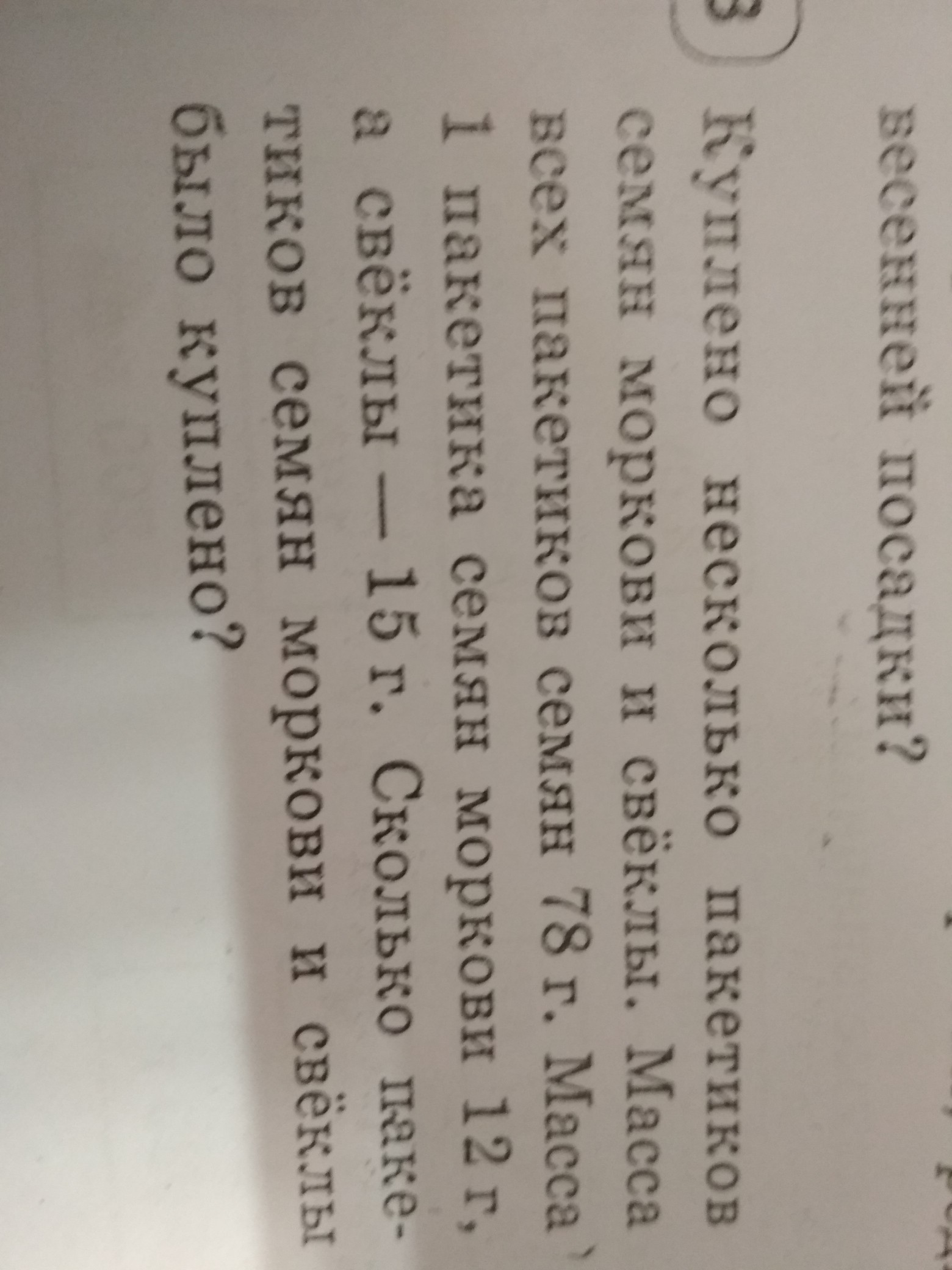 Всего семян 78грамм. В конце цифра 8. Сколько бы ни купил пакетов свеклы -в конце не может быть 8.Значит, чтобы в конце была восьмерка надо брать семена моркови и чтобы получить 8 надо 12 умножить на 4. Узнаем сколько граммов моркови мы купили