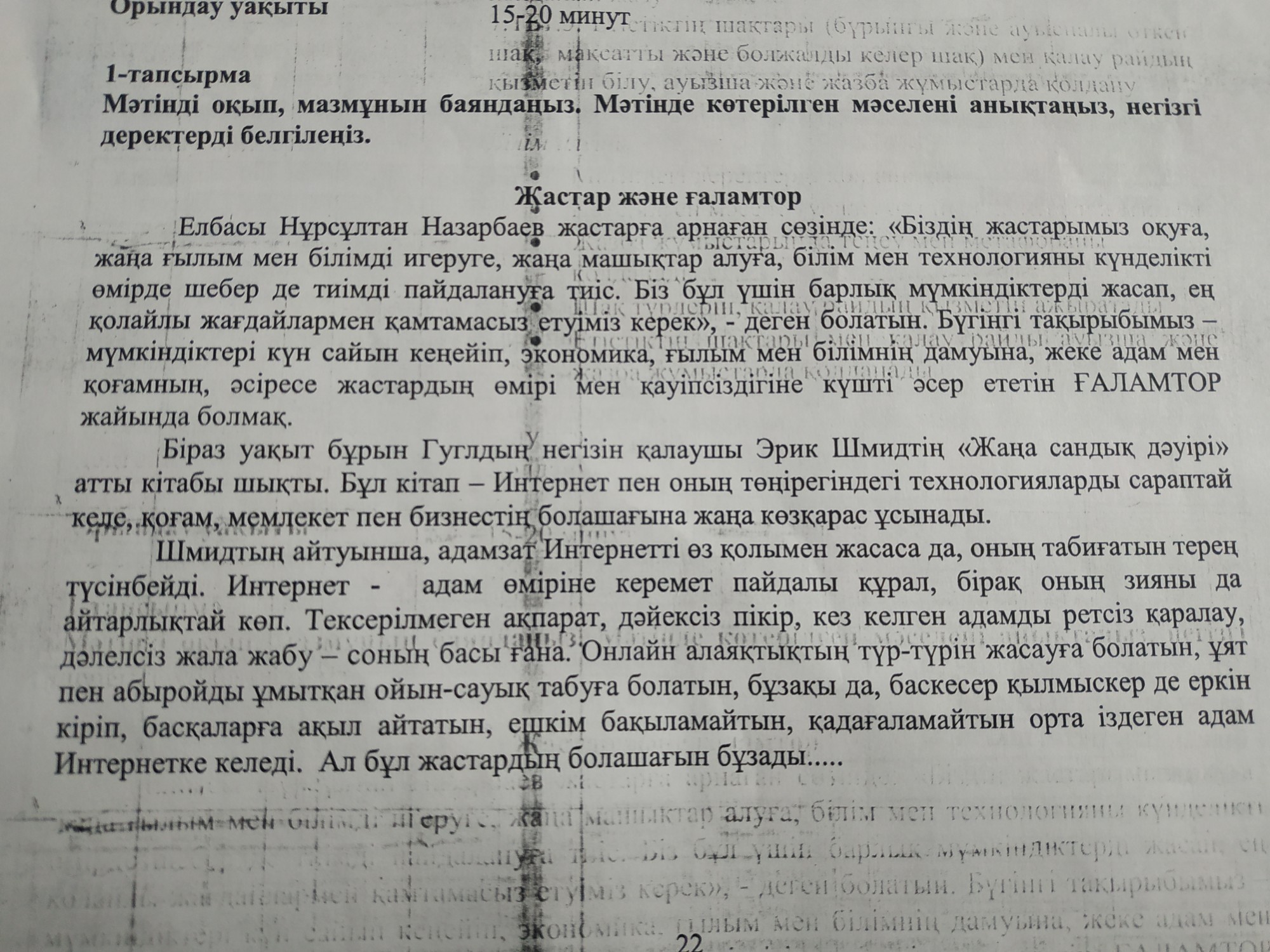 Мәтінде оқып , мазмунын баяндаңыз : Мәтіде көтерілген мәселені анықтаңыз , негізгіeгіз деректерді белгілеңіз. Даю 10 балов