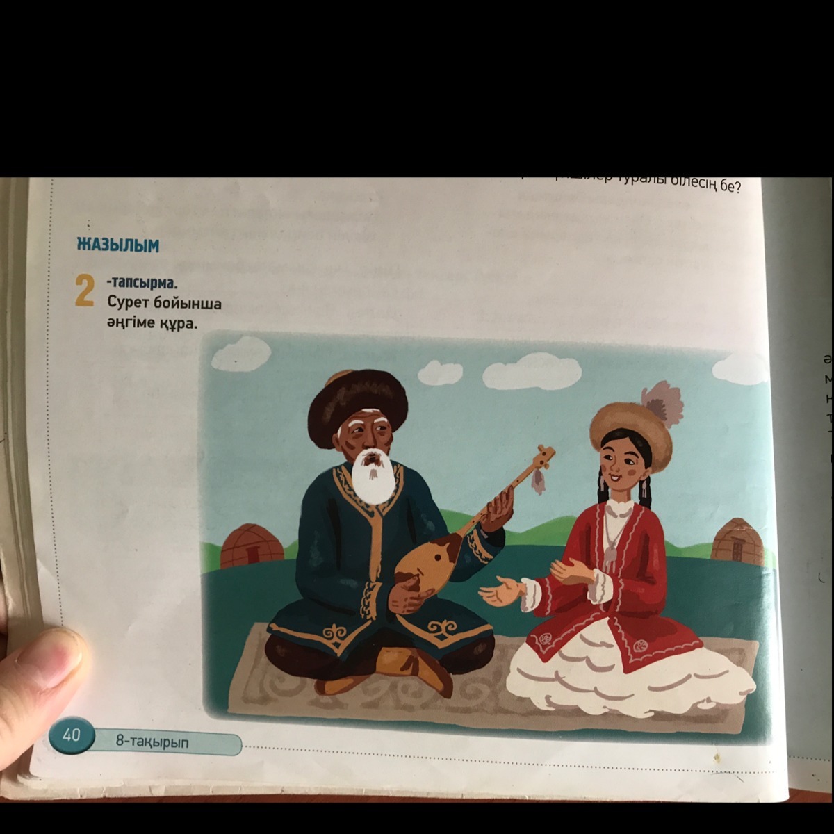 Бул Мадина. Ол жазда ауылга атасына барды. Атасы Мадинаға жаксы куй тартып берді, Мадинага ол куй катты унады. Атасында коптеген аспаптар бар екен. Атасы домбыраны казактын киелі аспабы деп Мадинага сыйга тартты. Мадина өте куанышты, Мадина атасынан куй тартып уйренбекші.