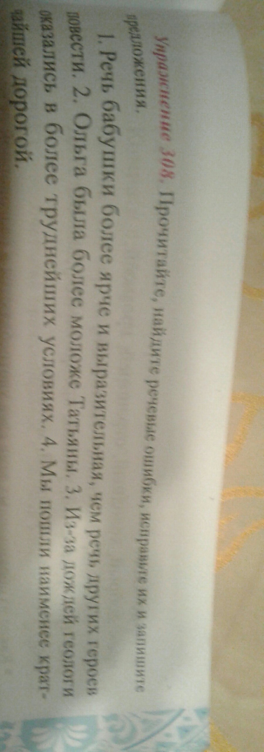1) Речь у бабушки более яркая и выразительная, чем у других героев повести. 2) Ольга была моложе Татьяны. 3) Из-за дождя геологи оказались в трудных условиях. 4) Мы пошли более длинной дорогой.
