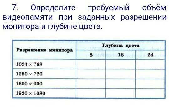 Все просто: перемножаем числа в разрешении и умножаем на глубину цвета. Глубина цвета дана в битах, однако, учитывая, что 8 бит = 1 байт можно сразу получать данные в байтах: в первом столбике в качестве глубины цвета берем один байт, во втором - два байта, в третьем - 3 байта. Результат во вложенном файле.
