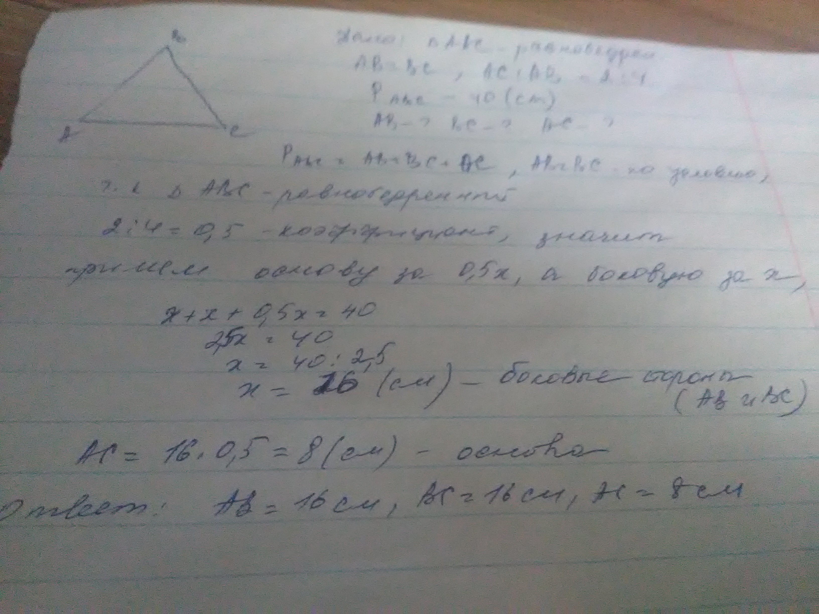 в раснобедренном треугольнике основание относится к боковой стороне как 2:4. Найдите стороны этого треугольника если периметр его равен 40 см.