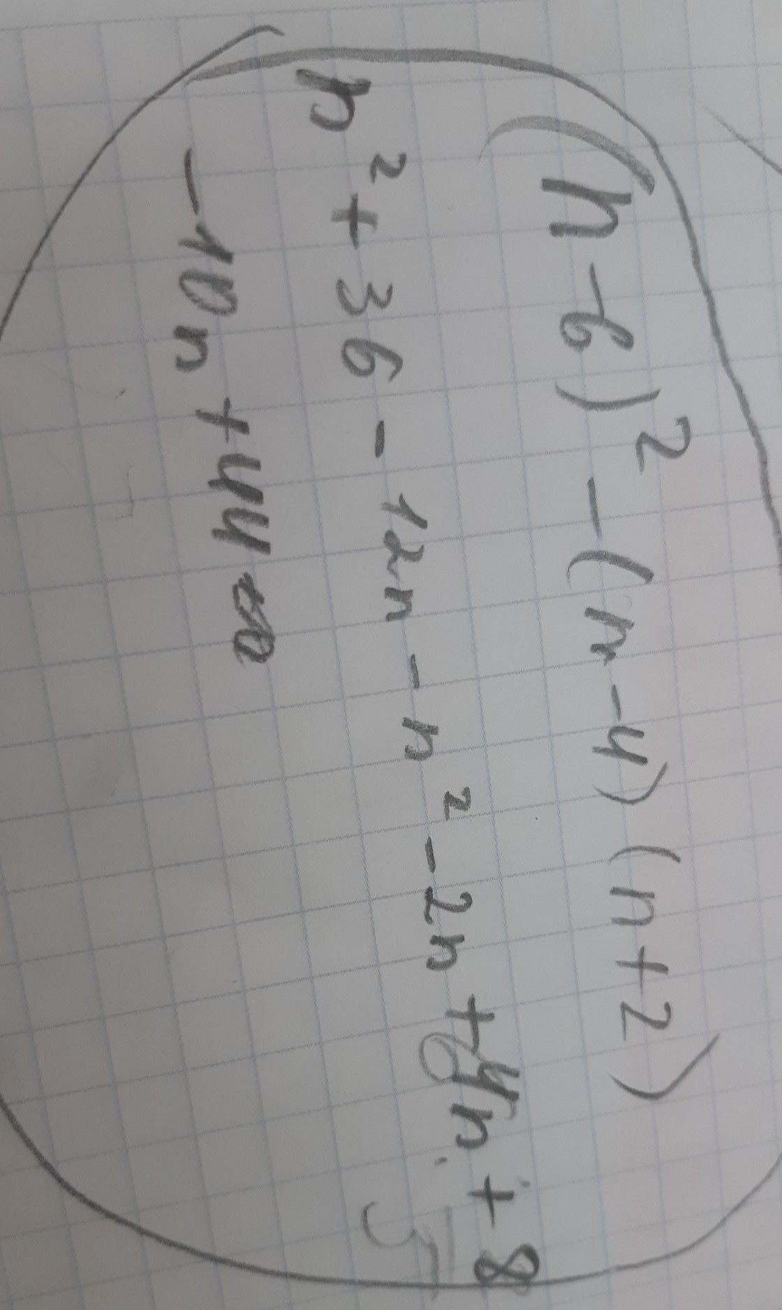 (n-6)²-(n-4)(n+2) =n²-12n+36-n²-2n+4n+8=-10n+44=44-10n