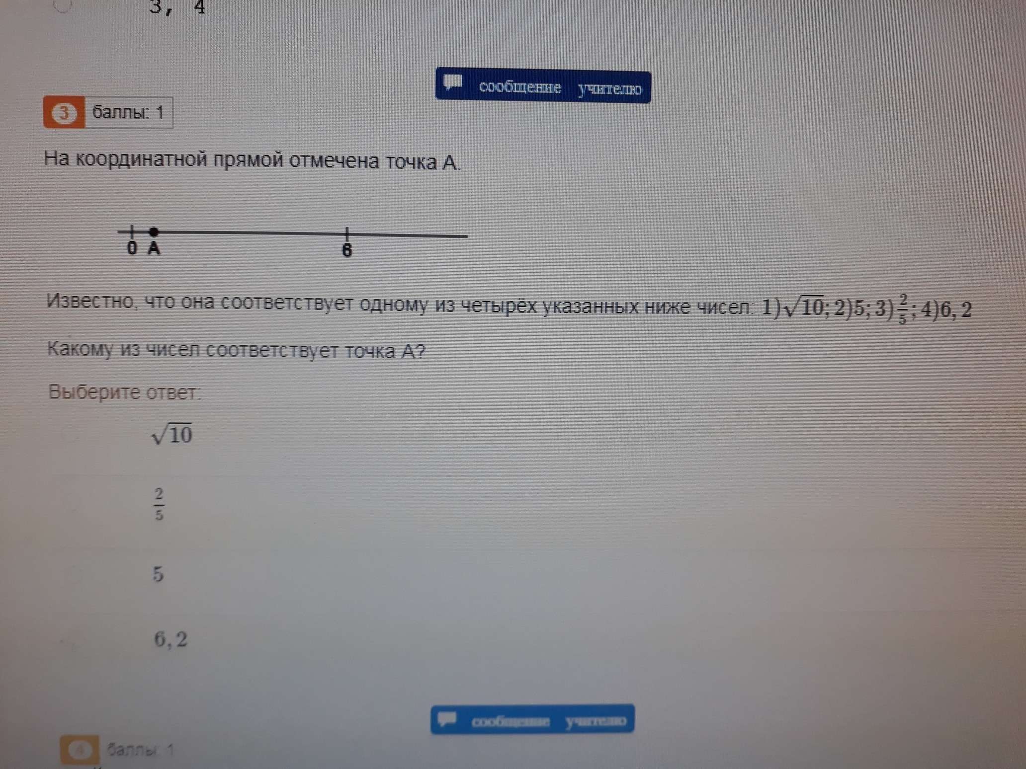 на координатной прямой отмечена точка а известно что она соответствует одному из четырёх указанных ниже чисел 1) корень из 10; 2) 5; 3)2/5; 4)6,2