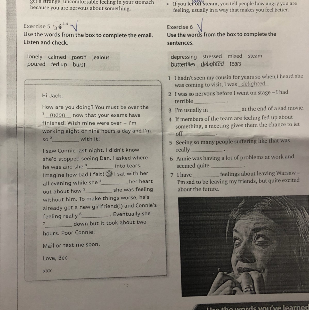 5. 2)fed up 3)burst 4)poured 5)lonely 6)jealous 7)calmed