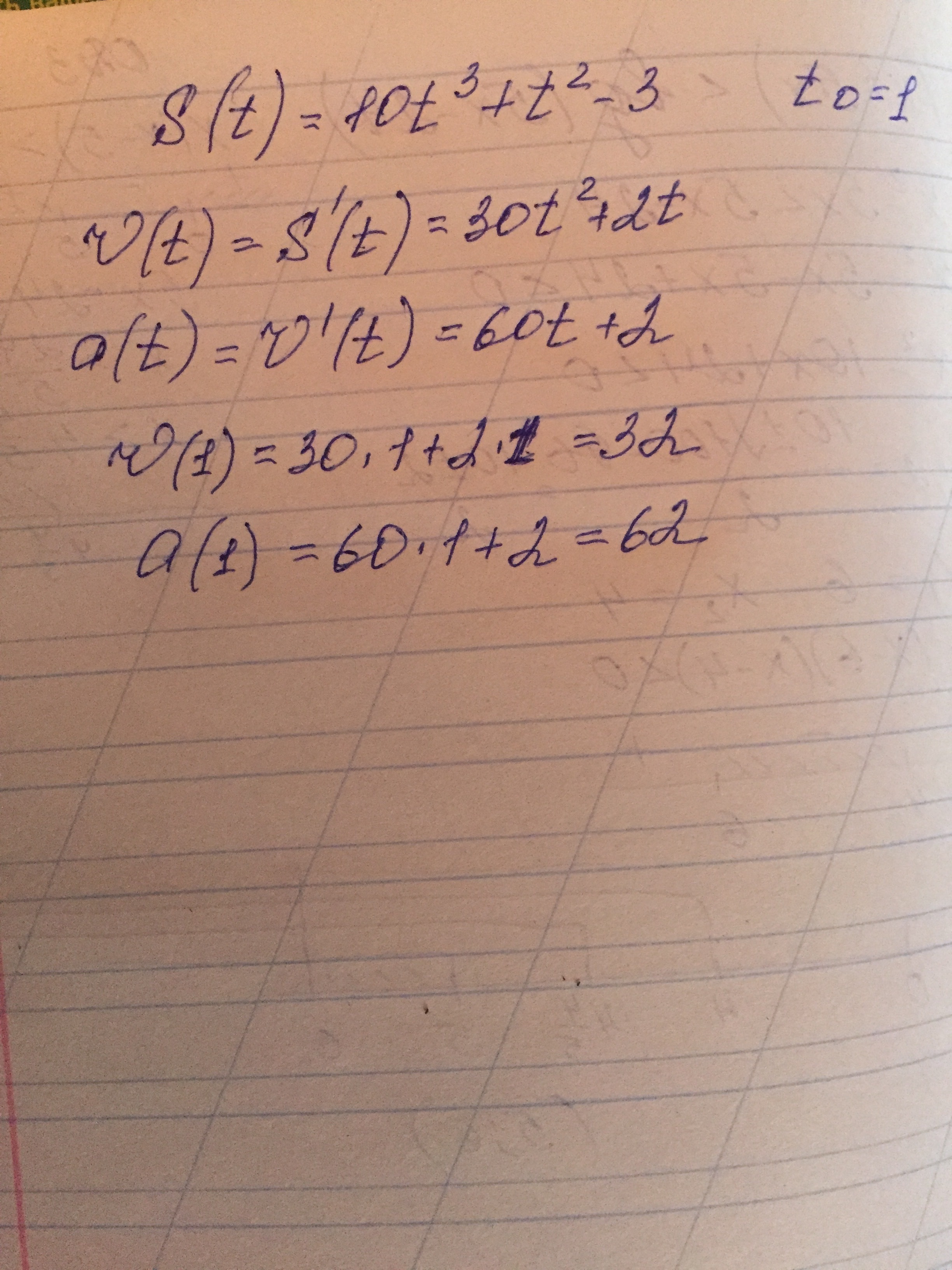 Материальная точка движется прямолинейно по закону S(t). Найдите её скорость и ускорение в момент времени t0.