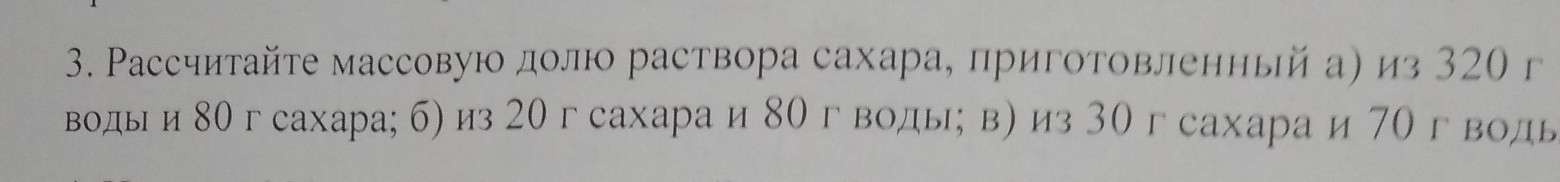 Срочно, помогите!!!рассчитайте массовую долю раствора сахара, приготовленный а) из 320 г воды и 80 г сахара; б) 20 г сахара и 80 г воды; в) 30 г сахара и 70 г воды.