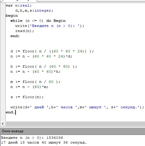 Определить какой по счёту день, час, минута и секунда. Например: 1536036 секунда от начала года - это 17 дней 18 часов 40 минут 36 секунд. Программа в Pascal