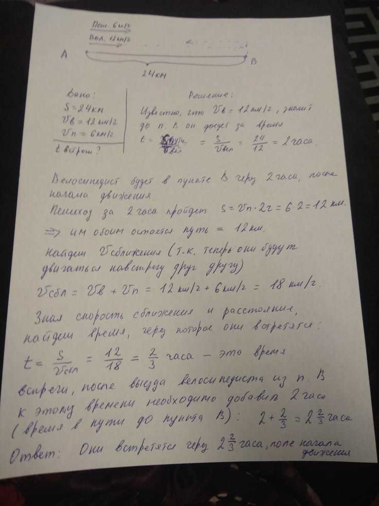 Из пункта А в пункт B, расстояние между которыми 24 км, выехал велосипедист со скоростью 12 км/ ч. Одновременно с ним из А в В вышел пешеход со скоростью 6 км/ч . Велосипедист доехал до В, повернул назад с той же скоростью. Через сколько часов после начала движения они встретятся?