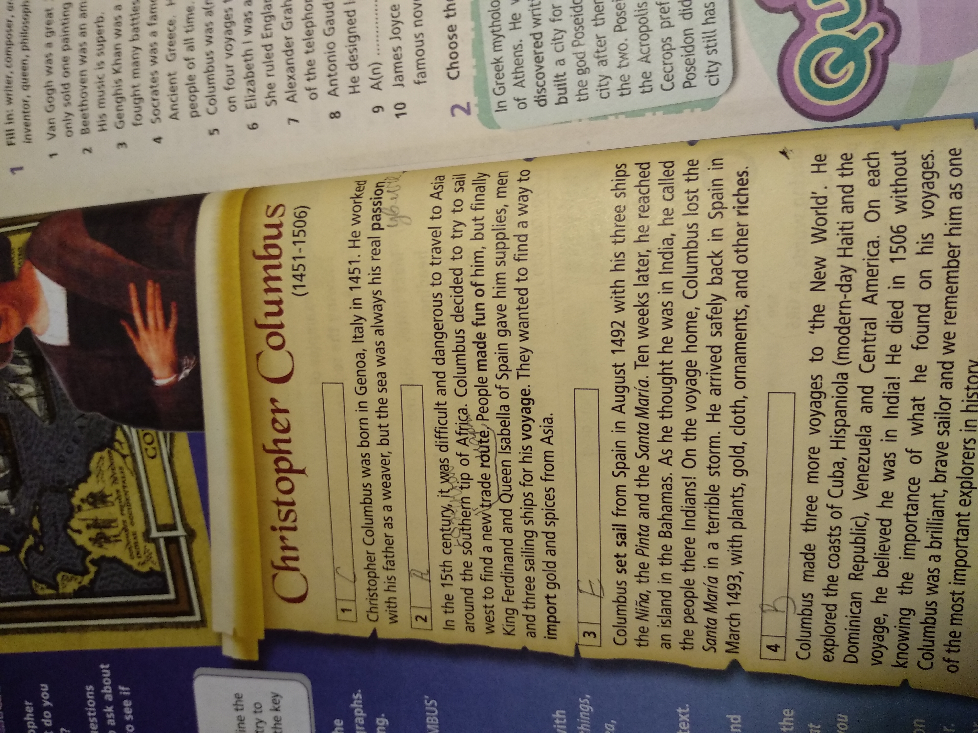 3.Колумб отправился из Испании в августе 1492 года на своих трех кораблях "Нинья", "Пинта" и "Санта-Мария". Десять недель спустя он достиг острова на Багамах. Поскольку он думал, что он был в Индии, он назвал людей там индийцами! В путешествии домой Колумб потерял Санта-Марию в страшном шторме. Он благополучно вернулся в Испанию в марте 1493 года с растениями, золотом, тканью, украшениями и другими богатствами.