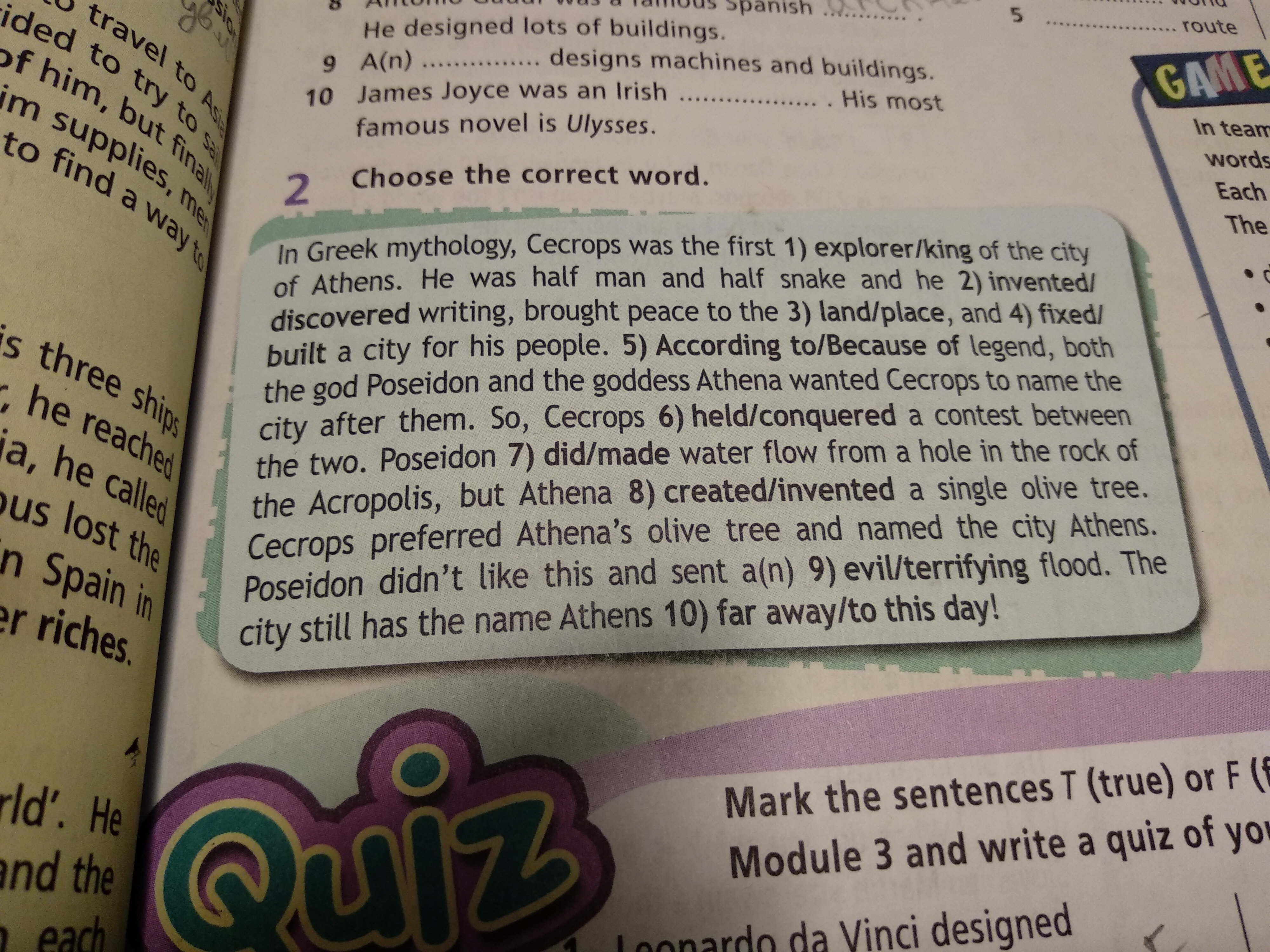 2-В греческой мифологии Кекропс был первым 1) исследователем / королем города Афин. Он был наполовину человеком и наполовину змеей, и он 2) изобрел открытое письмо, принес мир в 3) землю / место и 4) исправил построенный город для его людей. 5) Согласно легенде, и бог Посейдон, и богиня Афина хотели, чтобы Кекропс назвал город в честь них. Итак, Cecrops 6) провел / победил в состязании между ними. Посейдон 7) сделал / сделал поток воды из дыры в скале Акрополя, но Афина 8) создала / изобрела одно оливковое дерево. Кекроп предпочел оливковое дерево Афины и назвал город Афины Посейдону это не понравилось, и он послал (n) 9) зловещий / ужасающий потоп. Город до сих пор носит название Афины 10) далеко / по сей день!