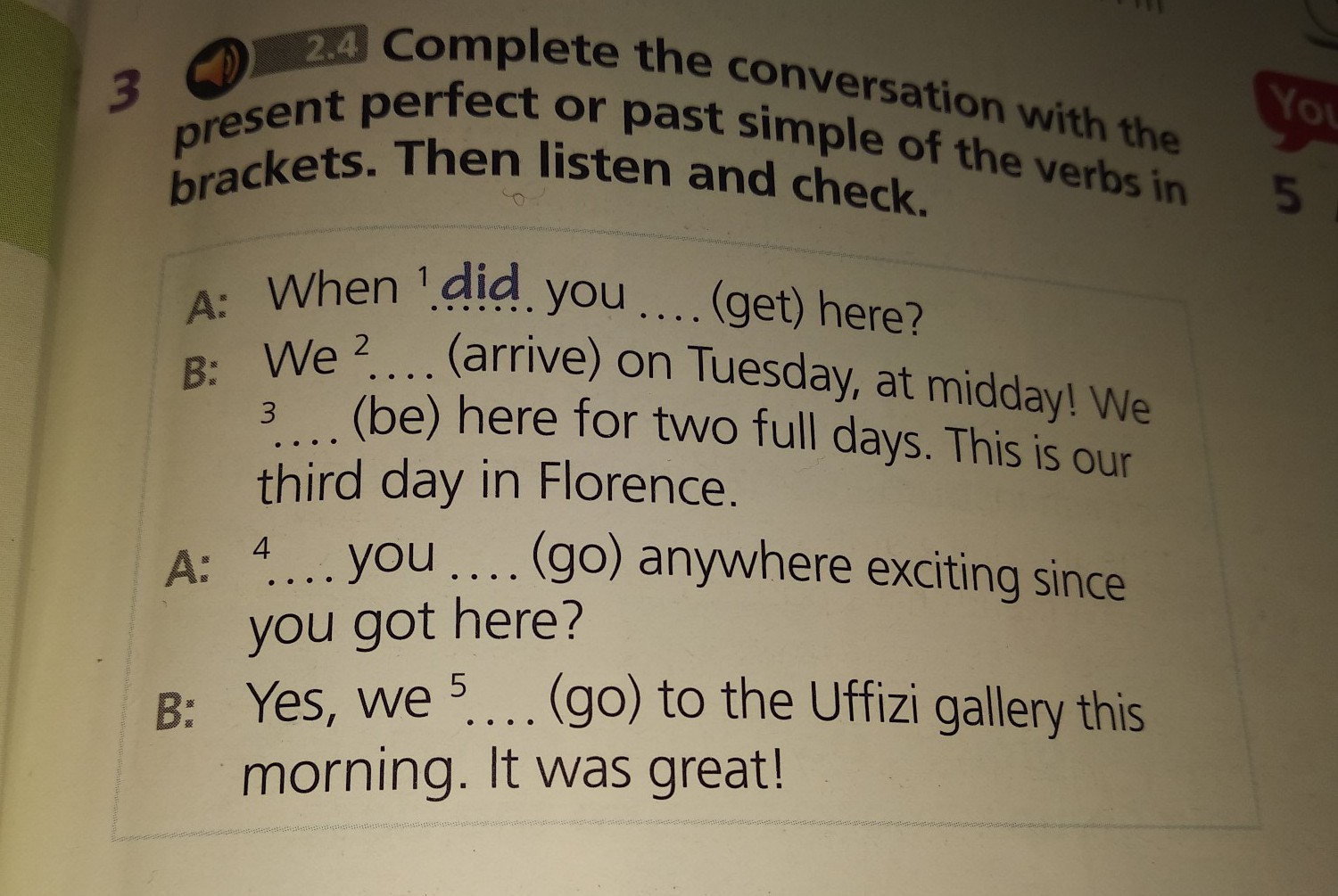 B: We (arrived) on Tuesday, at midday! We 3. (have been) here for two full days. This is our third day in Florence. Have you (gone) anywhere exciting since you got here?