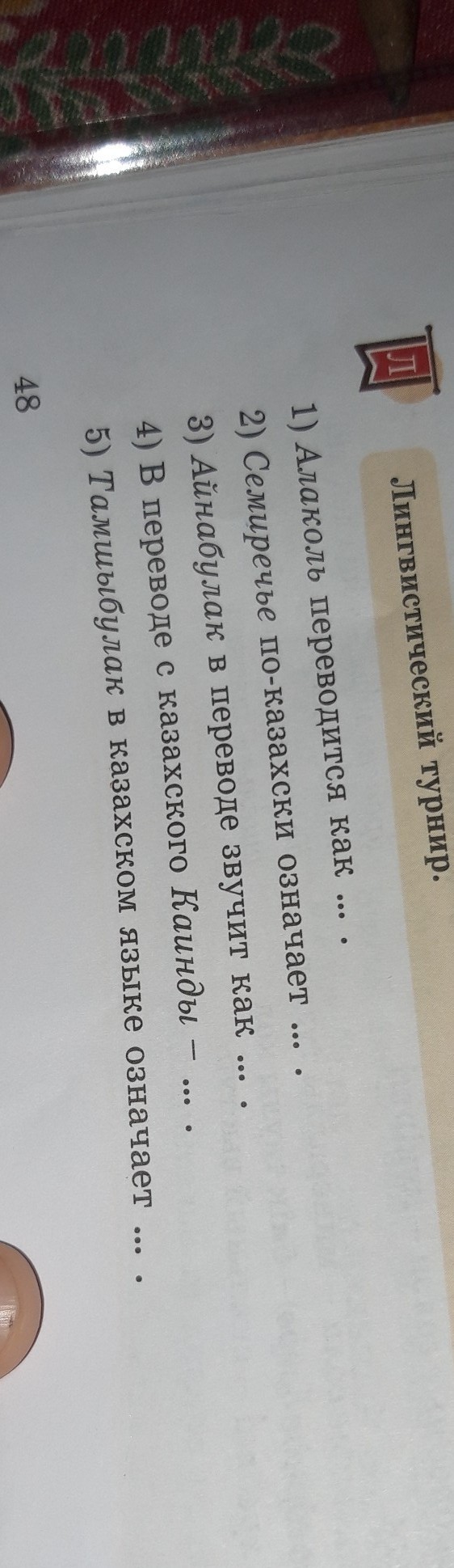 Алаколь это горько-соленое озеро, Семиречье это географическая область в Азии, Айнабулак это село в подчинении администрации, Каинды это озеро на казахском и Тамшыбулак это родник в селе Капал