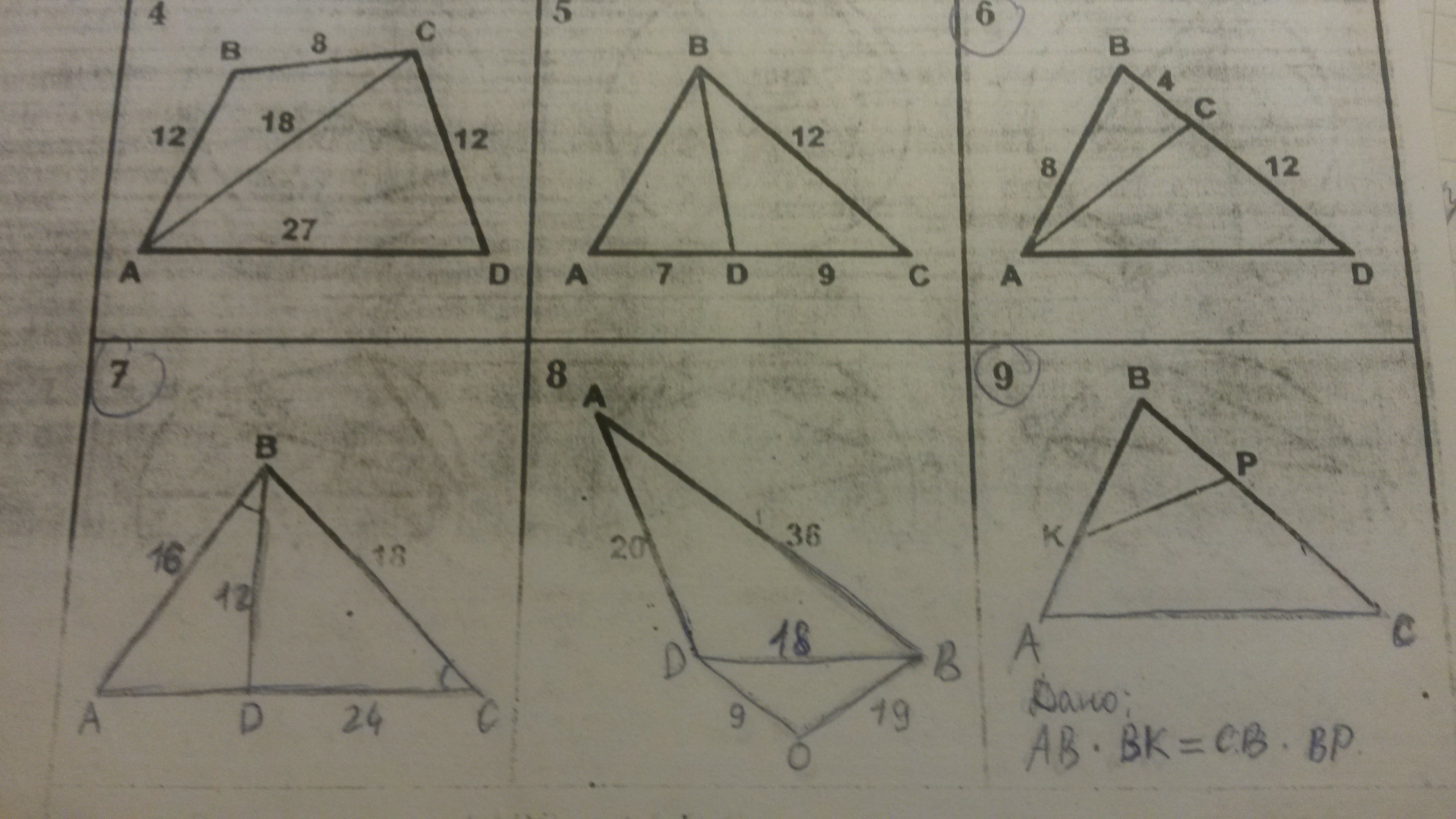 номер 6,7,9 (найти подобные треугольники и доказать их подобие по 2 или 3 признаку)