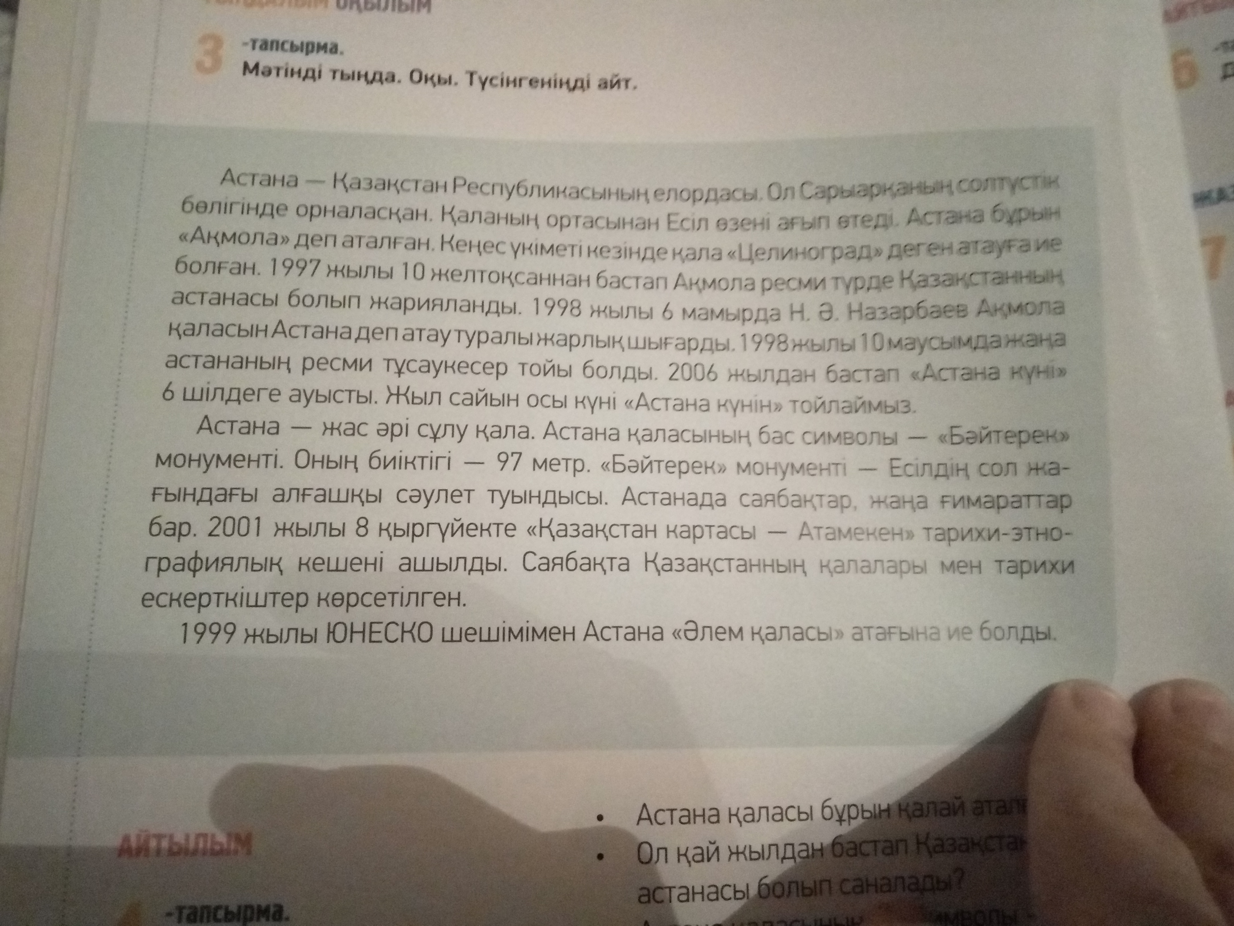 Астана - это красивый и молодой город. Главным символом Астаны является - "Байтерек". Его высота - 97 метр. Монумент "Байтерек" - первый архитектура который расположен на севере Есиле. В Астане есть новые парки и здания. В 8 сентября 2001 года в карте Казахстана открылся исторический-этнографический жилой комплекс Атамекен. В парке показаны города и исторические памятники Казахстана.