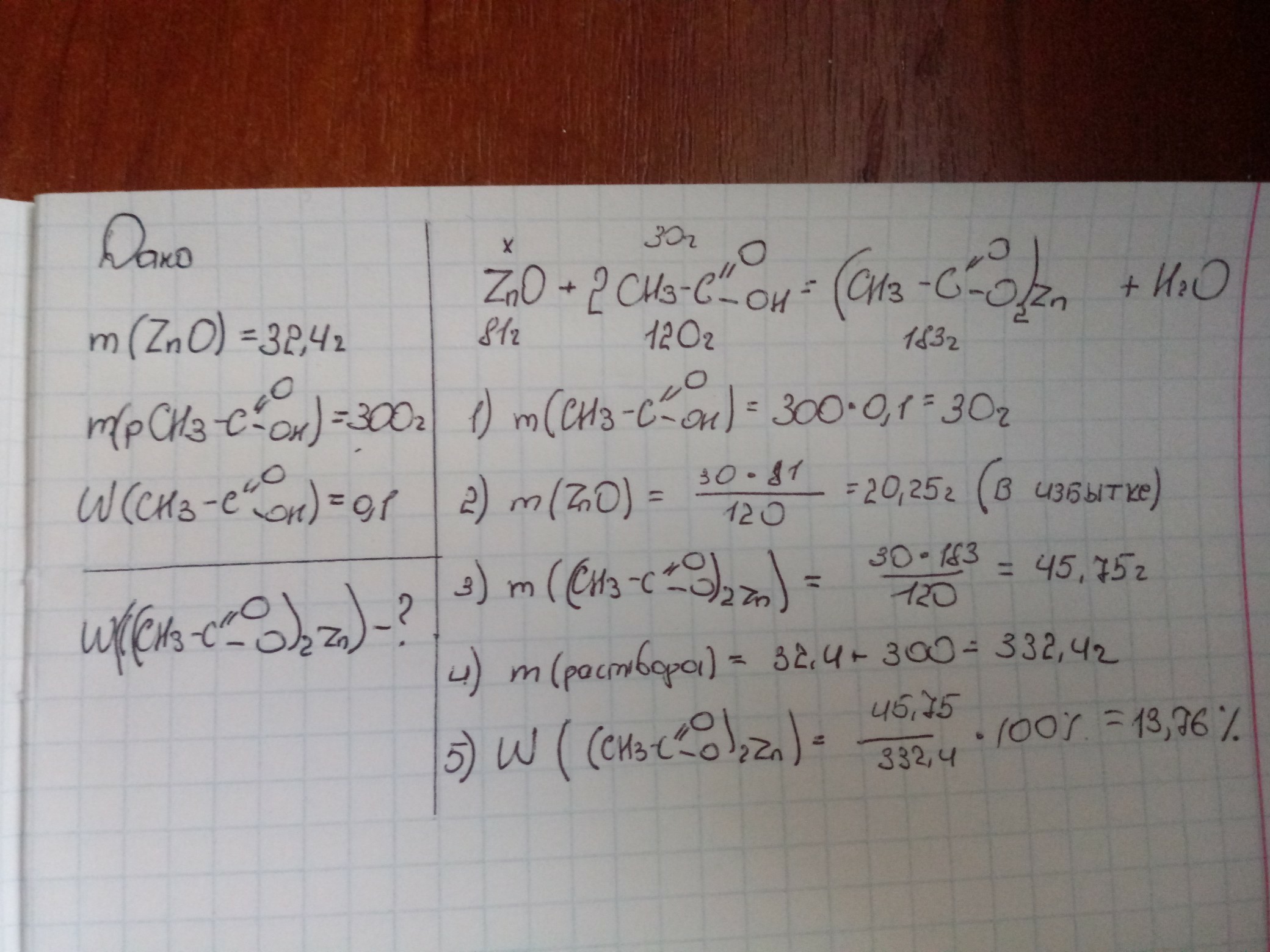 (100б) Порцию оксида цинка массой 32,4 г добавили к 10%-му раствору уксусной кислоты массой 300г. Вычислите массовую долю ацетата цинка в растворе после реакции.