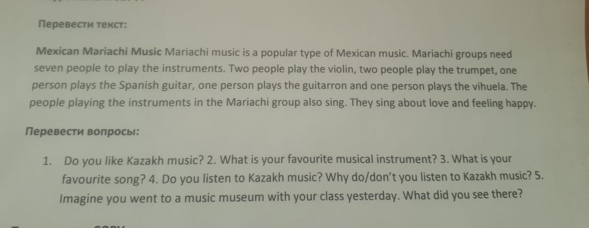 1. Тебе нравится музыка Казех? 2 Какой твой любимый музыкальный инструмент? 3 Какая твоя любимая песня? а. Ты слушаешь казахскую музыку? Почему вы не слушаете сазачскую музыку? 5 Представь, что ты вчера ходил в музей музыки со своим парнем. Что ты там увидел?