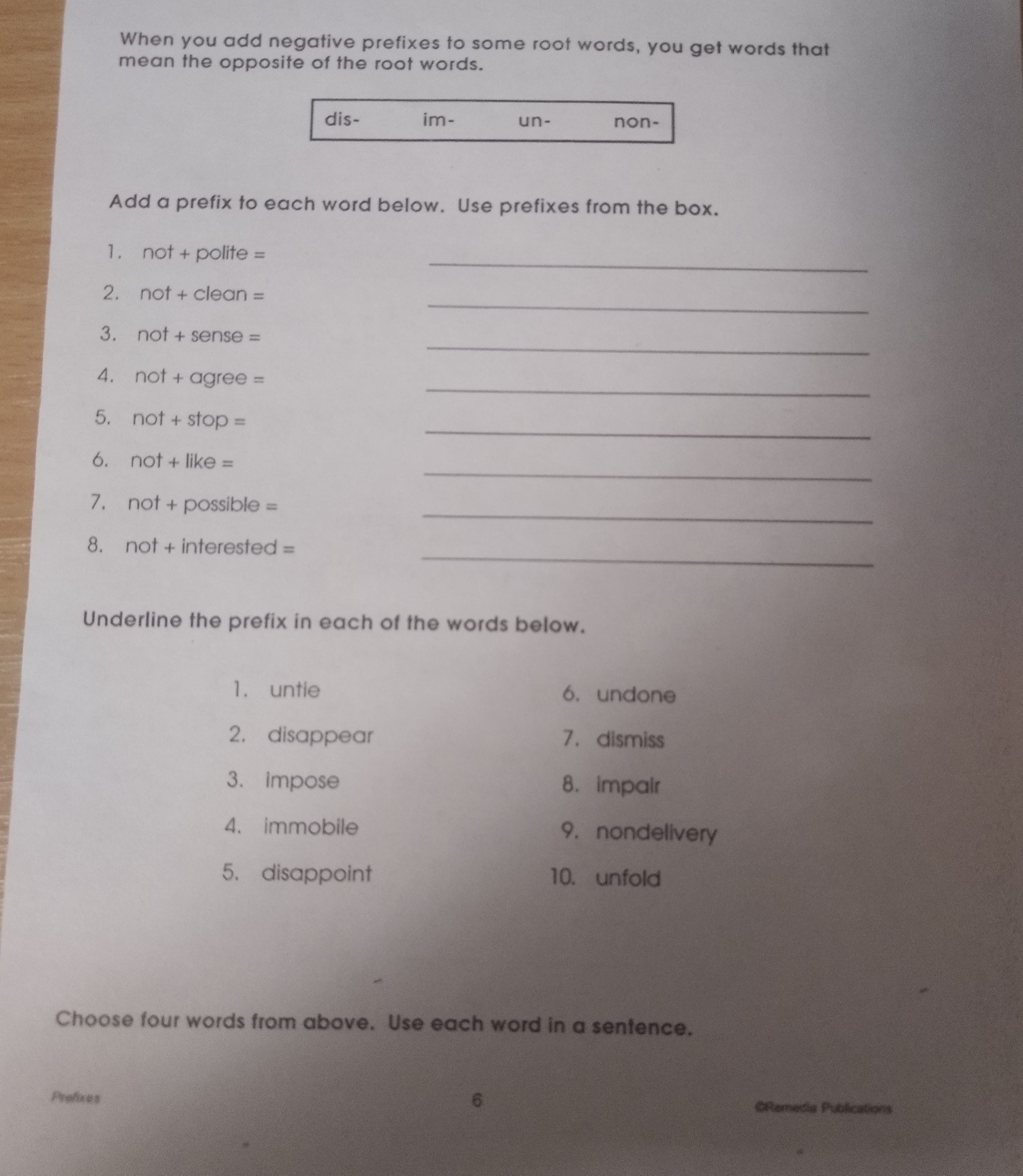 1. Un- 2. Dis- 3. Im- 4. Im- 5. Dis- 6. Un- 7. Dis- 8. Im- 9. Non- 10. Un-