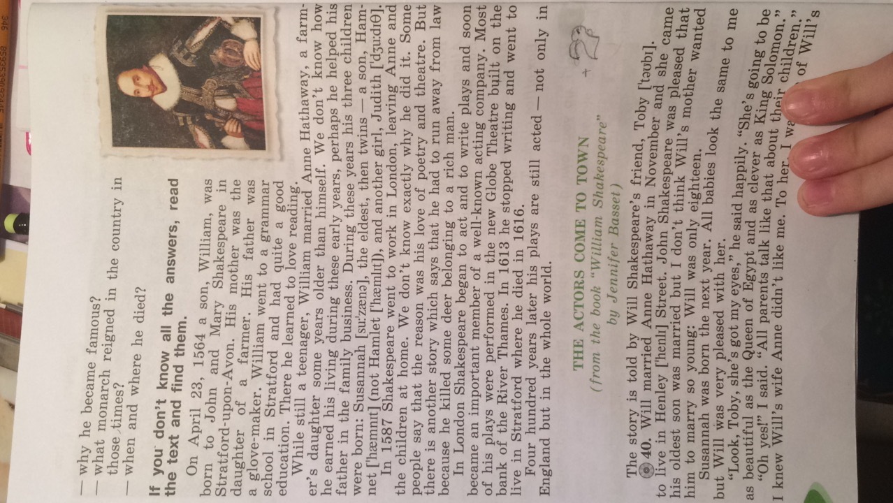 Перевод: 23 апреля 1564 года сын Вильям был рождён у Джона и Марии Шекспир в Стратфорде. Его мама была дочь фермера. Его отец был перчаточником. Вильям ходил в грамматическую школу в Стратфорде,где получил хорошее образование.