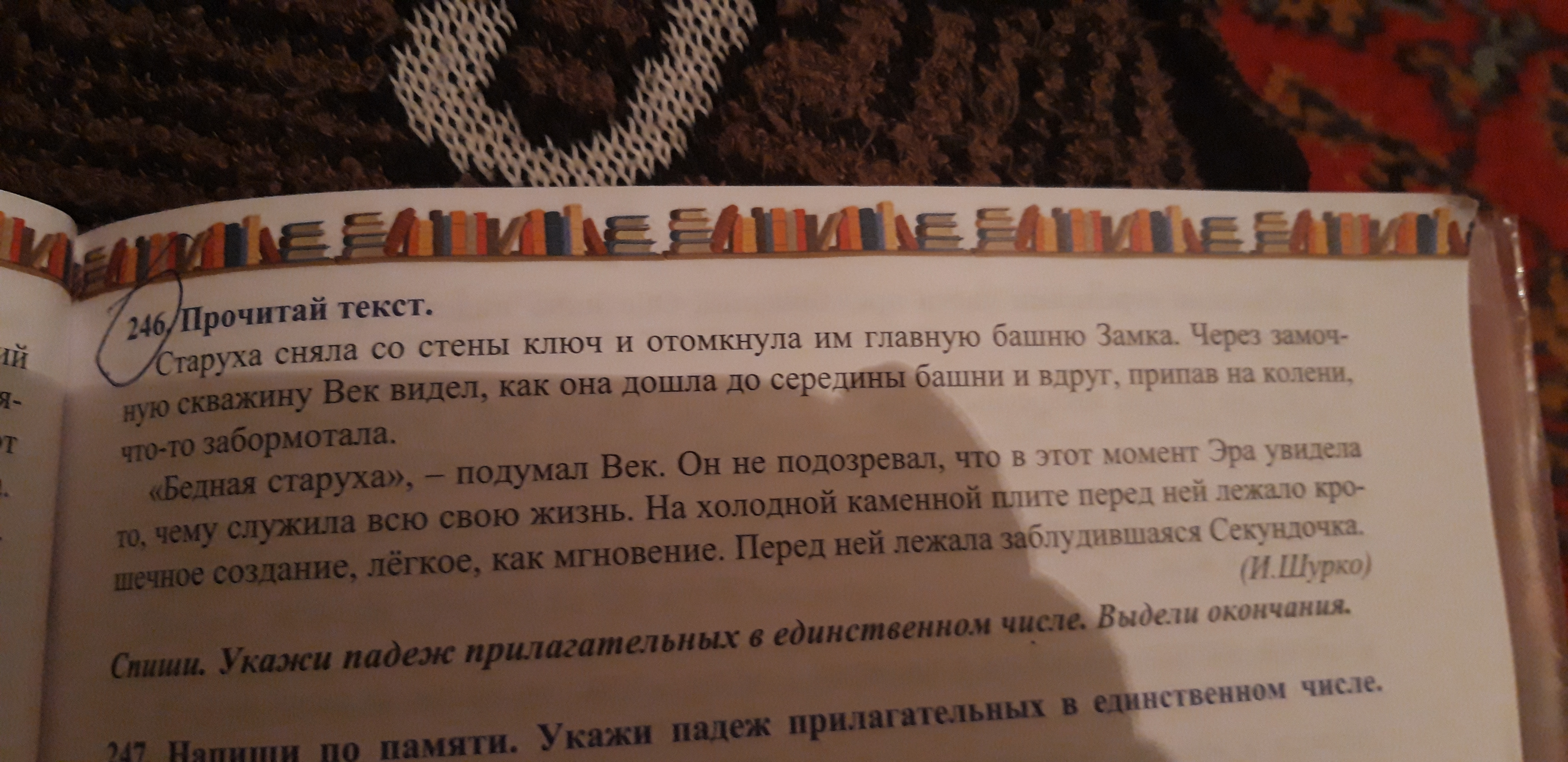 246.Главную(В.п.)башню,замочную(В.п.)скважину,бедная(И.п.)старуха,на холодной(П.п)каменной(П.п.)плите,крошечное(И.п.)создание легкое(И.п.),заблудившаяся(И.п.)Секундочка.