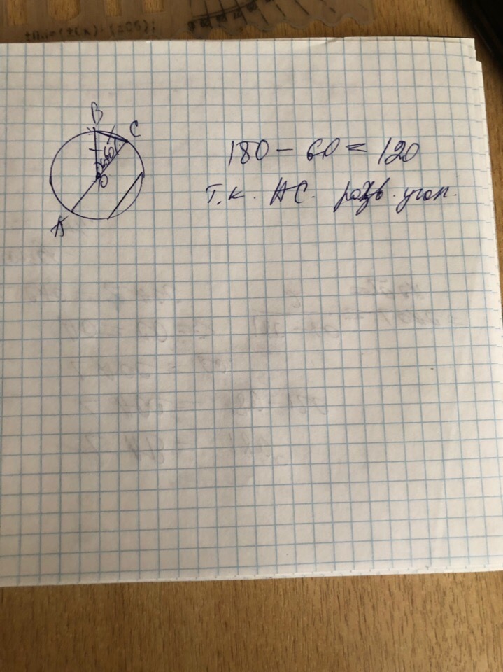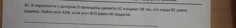 Помогите В окружности центром O проведены диаметры AC и радиус OB так, что хорда BC равна радиусу. Найти угол AOC, если угол BCO равен 60 градусов