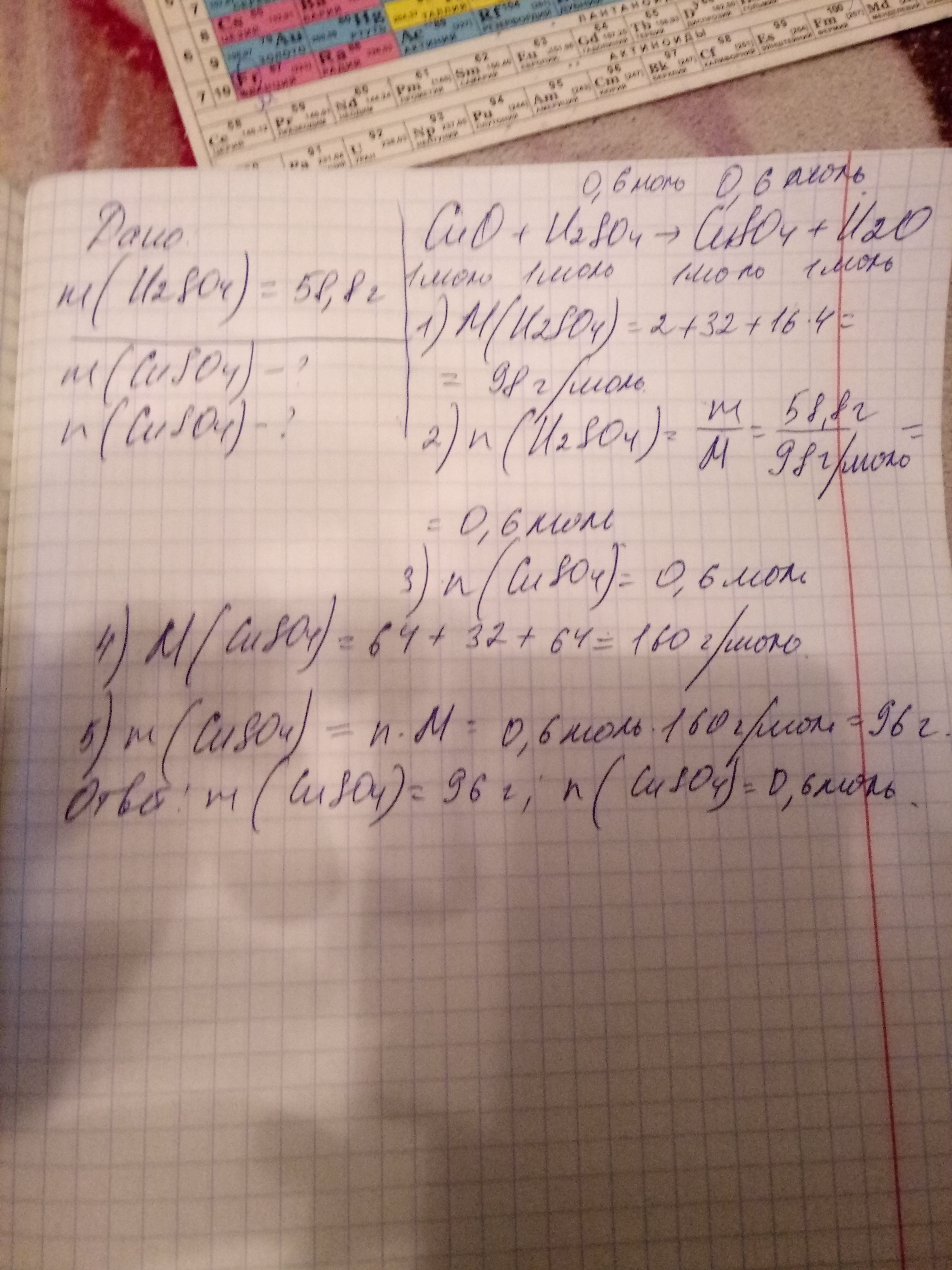 Рассчитайте массу и количество вещества соли, полученной при взаимодействии 58,8 г. серной кислоты с избытком оксида меди (2). Уравнение химической реакции: CuO + H2SO4 = CuSO4 + H2O