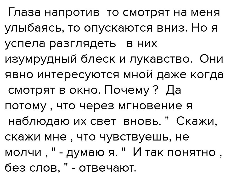 Глаза напротив то смотрят на меня улыбаясь ,то опускаются вниз .Но я успела разглядеть в них изумрудный блеск и лукавство. Они явно интересуются мной даже когда смотрят в окно.Почему ?Да потому, что через мгновение я наблюдаю их свет вновь. Скажи ,скажи мне что чувствуешь, не молчи -думаю я. И так понятно без слов.